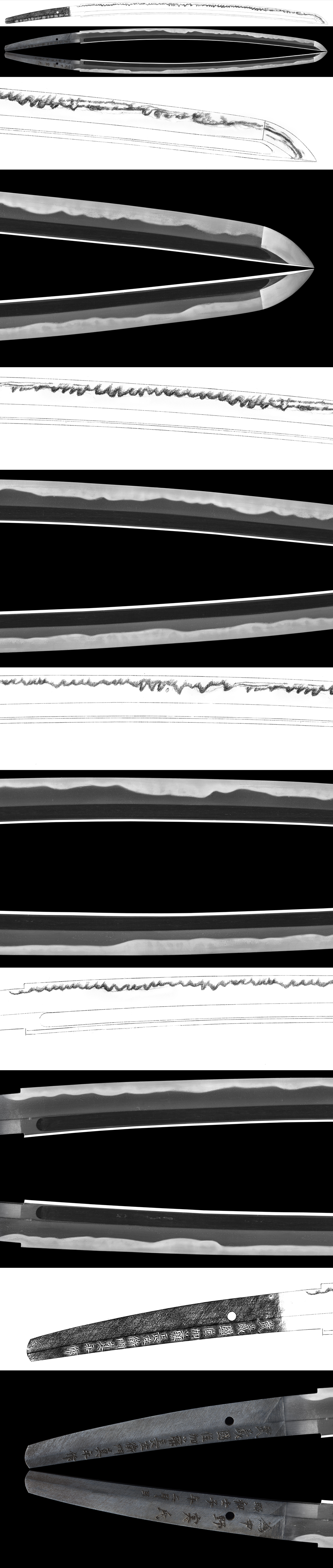 Hamon: Nie-deki. Gunome-midare waves with deep nioi-kuchi including togari-ba. Sunagashi has the charm of variety that graces the hamon.