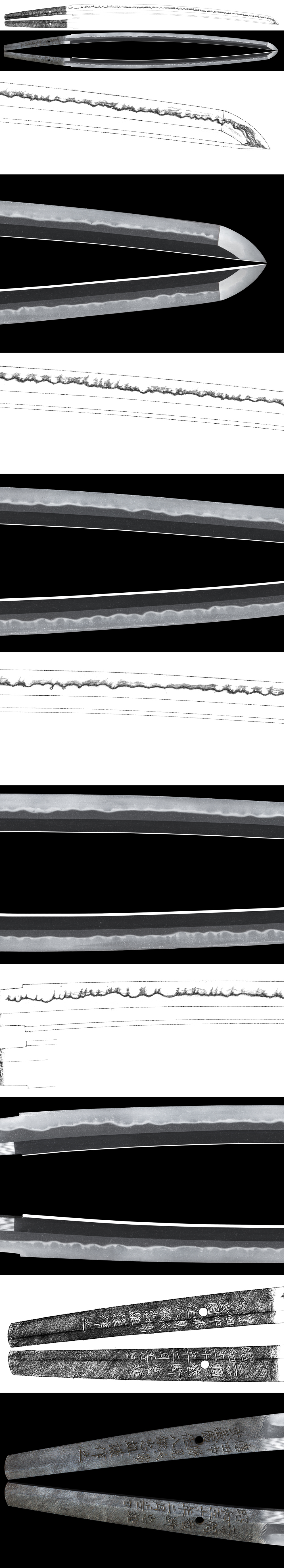 Hamon : Nie deki Gunome midare with Ashi. In Ha, there are Sunagashi and Kinsuji.
