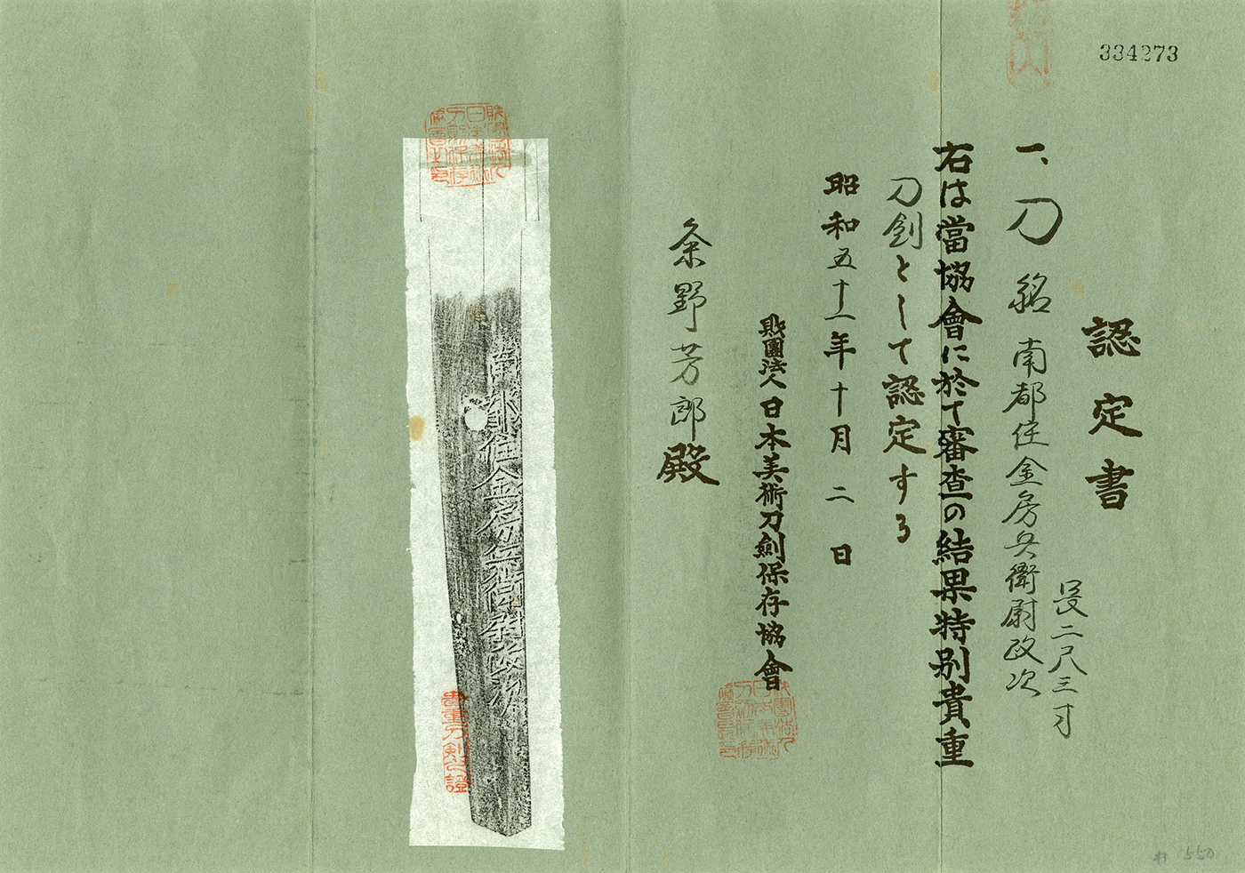 Signature : Nanto Ju Kanebo(Kinbo) Hyouei Jo Masatsugu