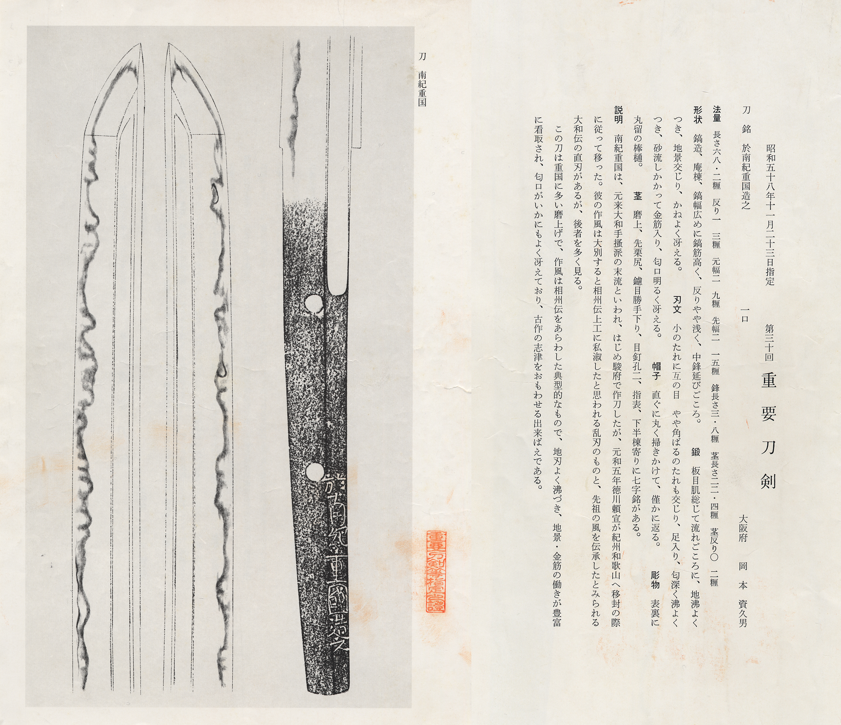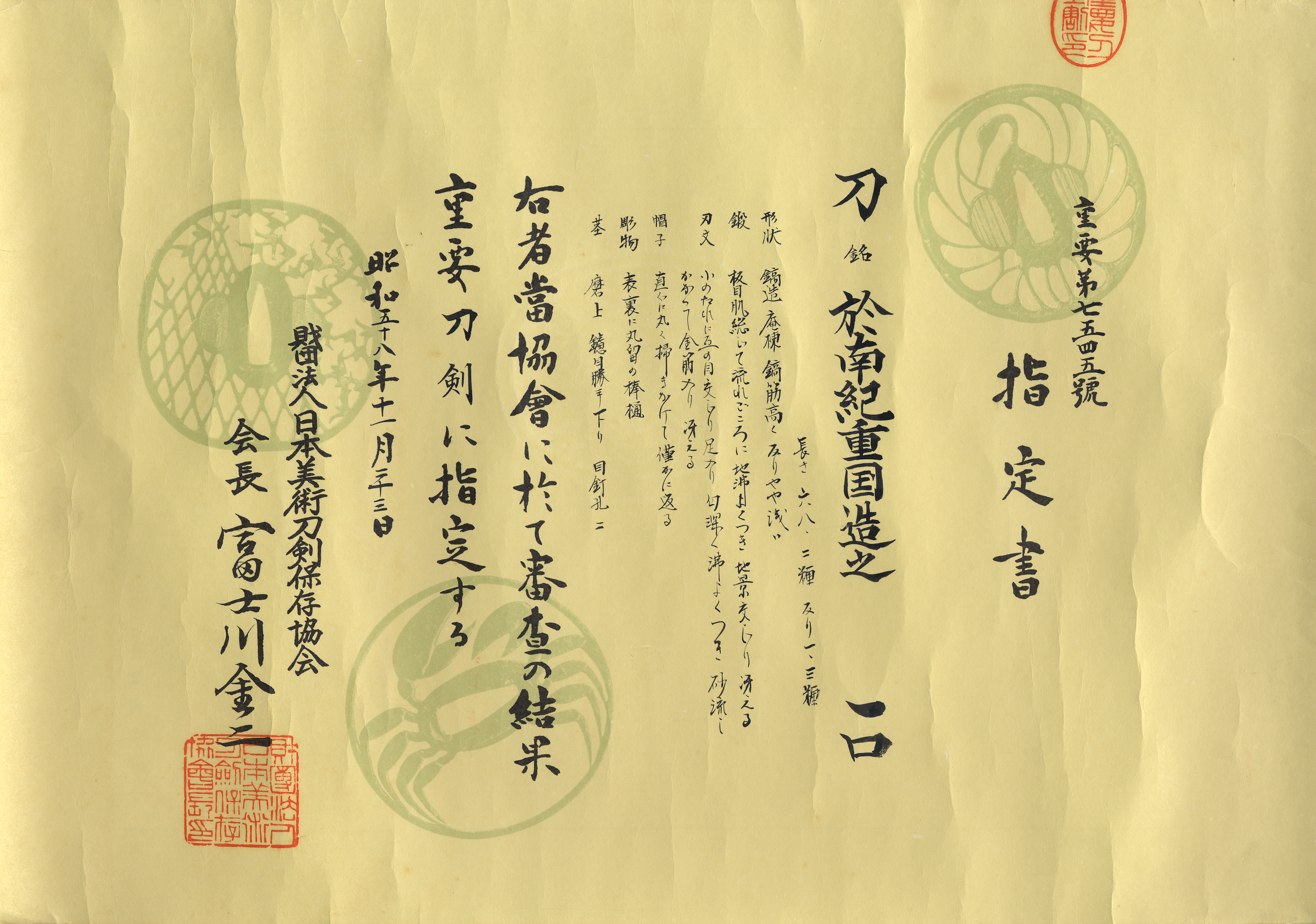 Shinto:Saijyo saki (highest) sword ranking:Ryowaza mono (very good cut well sword ranking)