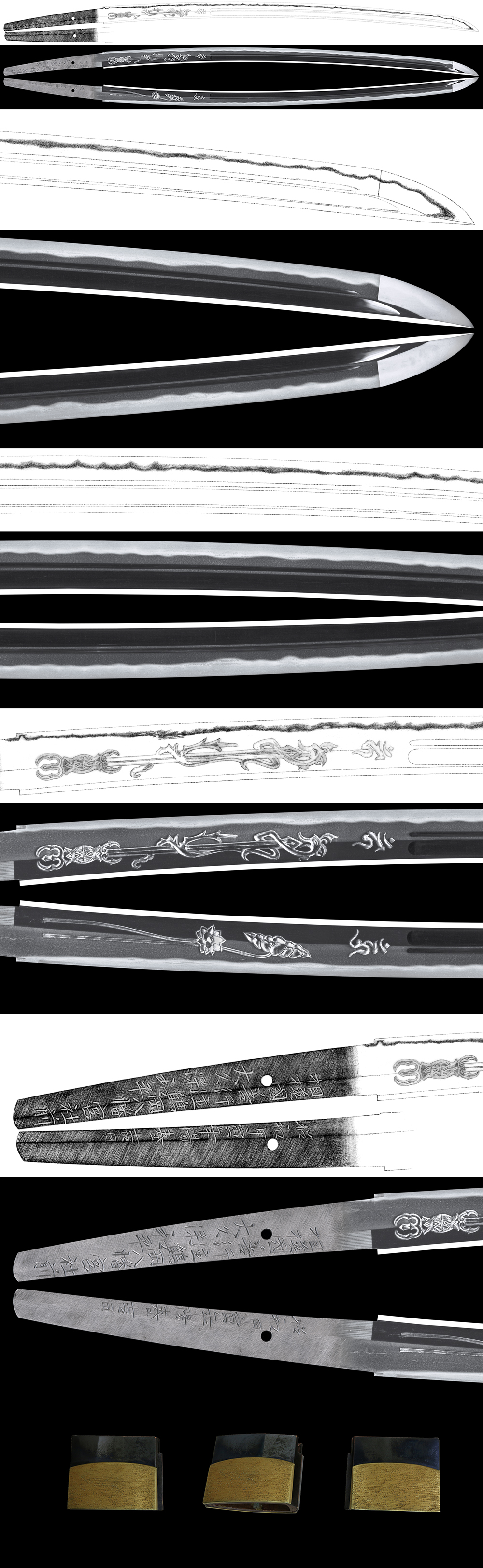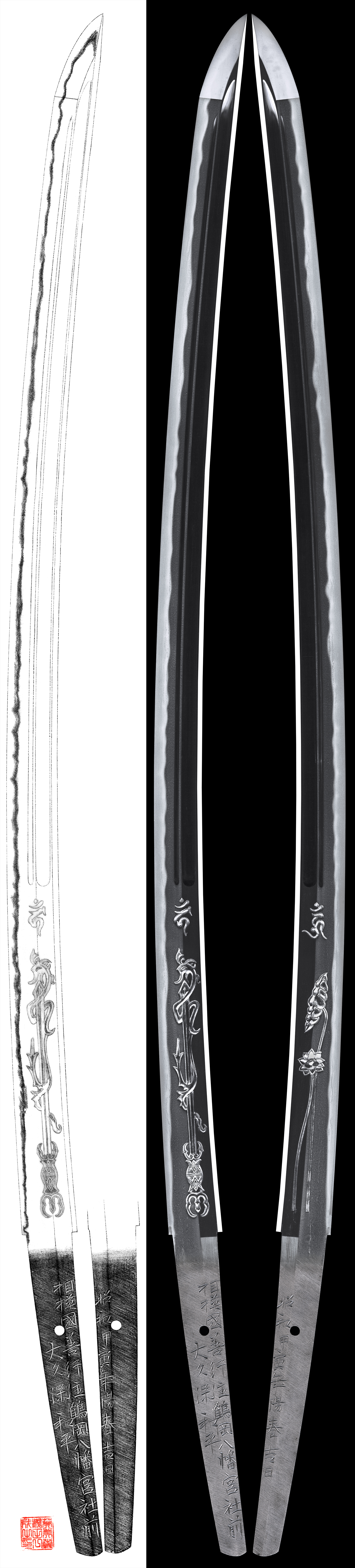 This blade is long and wide and thick, on the front side there is a dragon wrapping on a sword and dokko engraved. On the back side is two lotus flowers engraved.