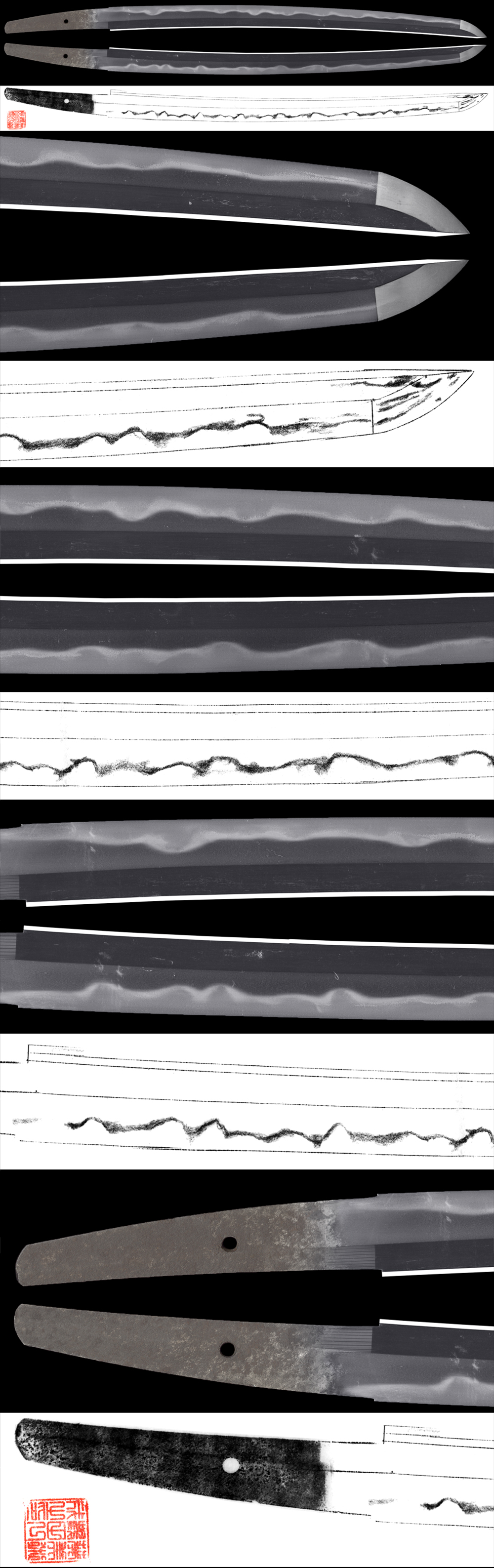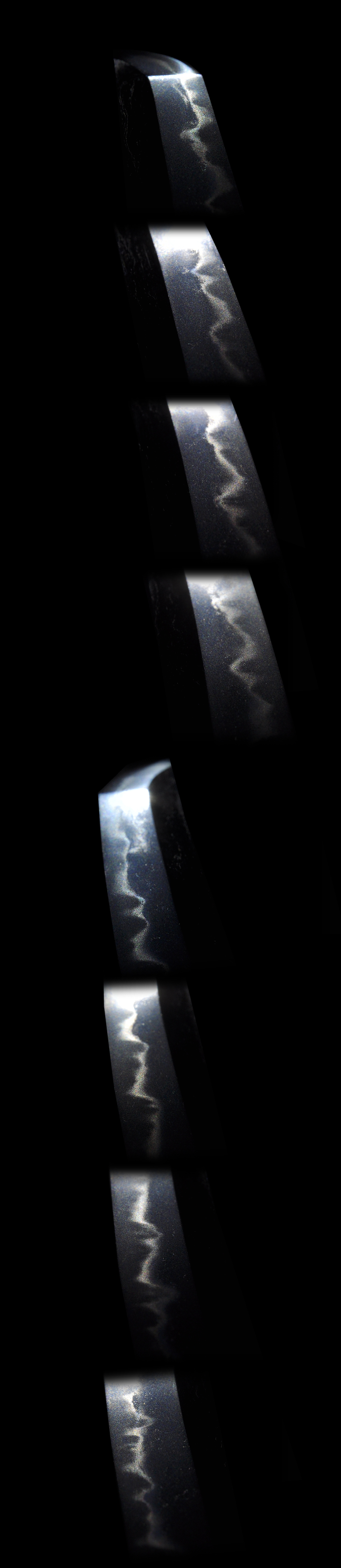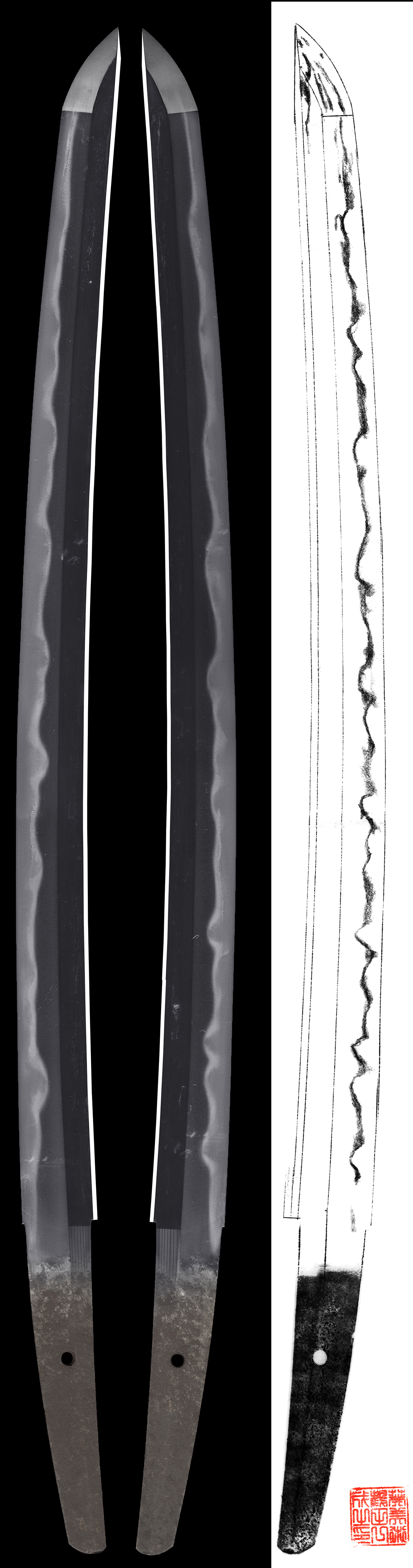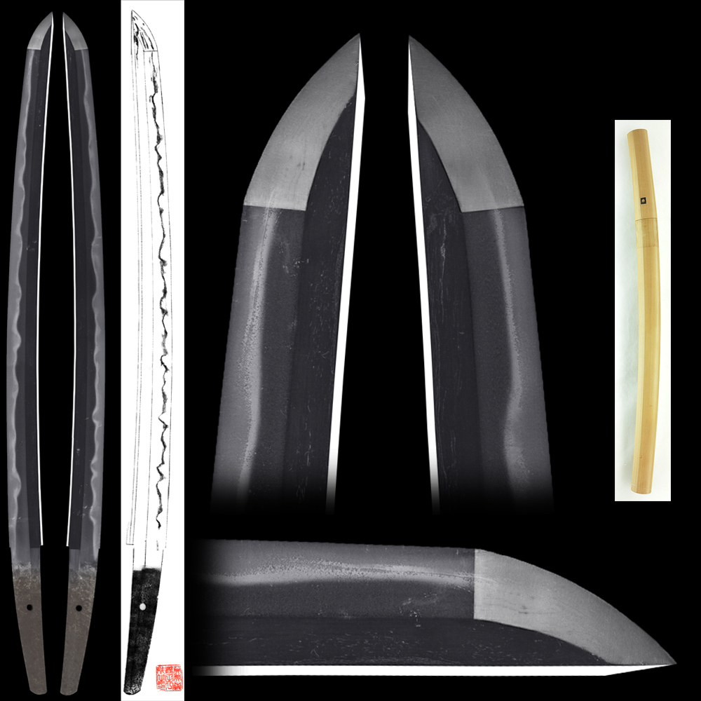 Hamon : Nie-deki, deep Nioikuchi Notare and Gonome mix with Jinchu Saryu Kinsuji working. Boshi is Midarekomi Yakisage shape.