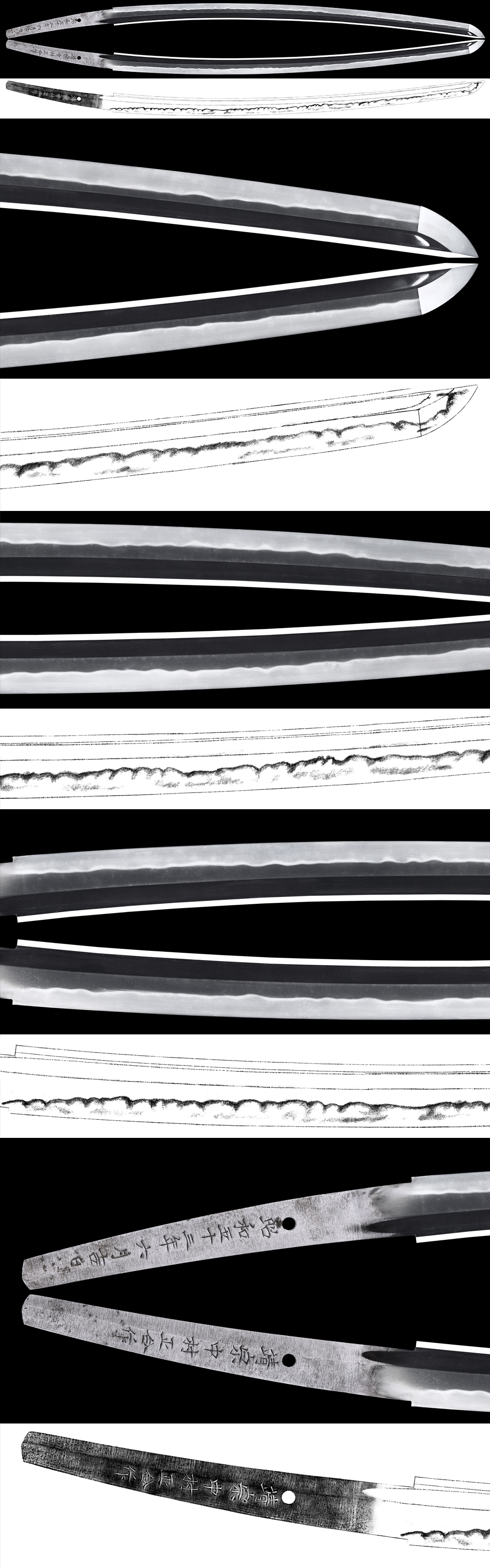 Hamon : Niedeki gunome midare with rather thick nioikuchi and ash, yo work in Hamon. Boshi is midarekomi style.
