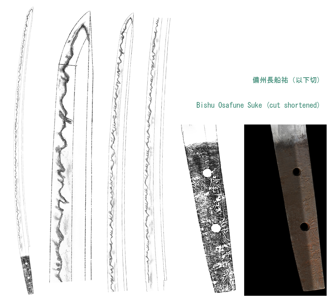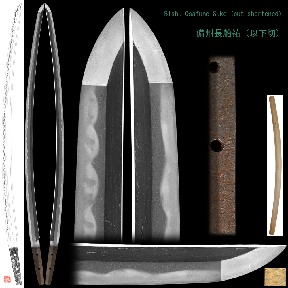 Shape : The blade was cut shortened but the signature is mentioned as Bishu Osahune Suke (sada) The blade is regular sized with deep sori and rather longer kissaki nice elegant shaped sword.