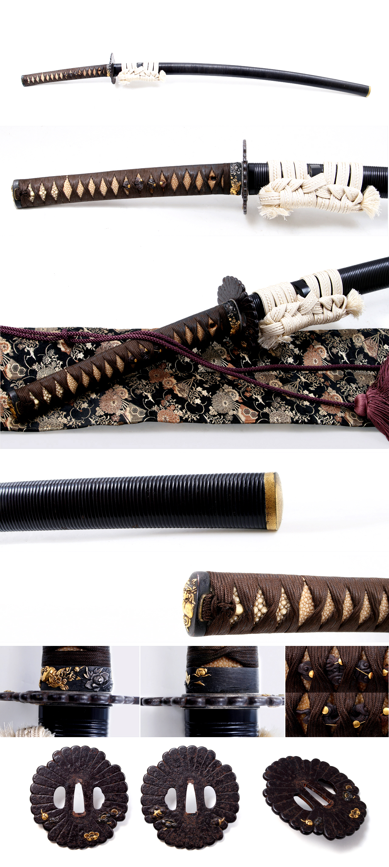 Tsuba : On the iron Tsuba, Ume flower is engraved with gold color Iroe.