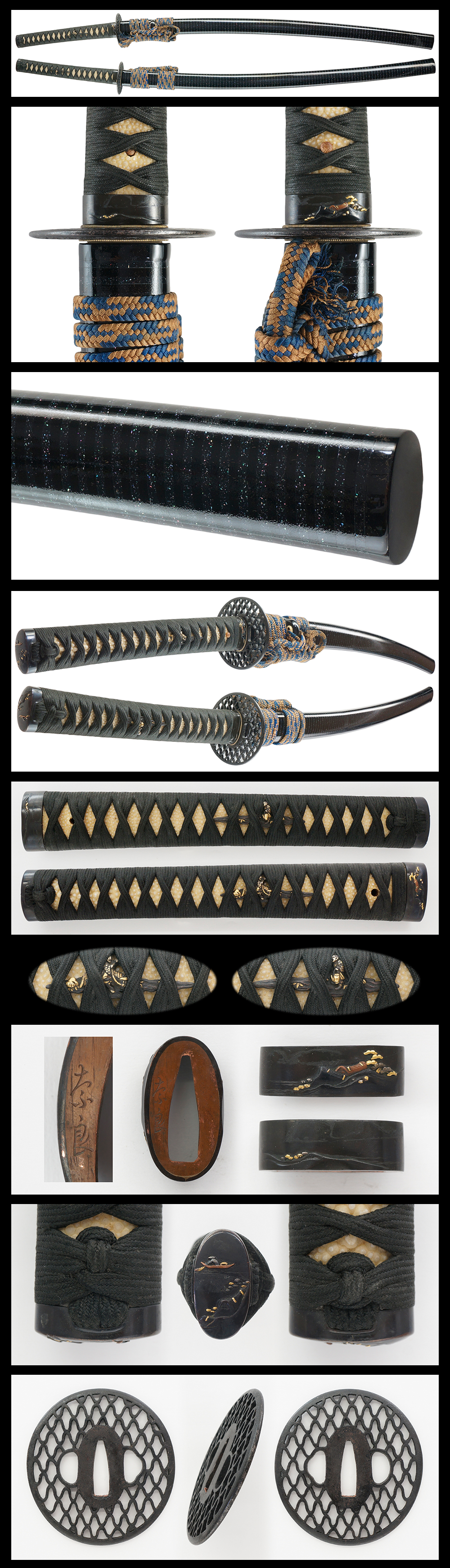Saya : Black Roiro Saya with Aogai Chirashi(blue shell) and striped pattern.