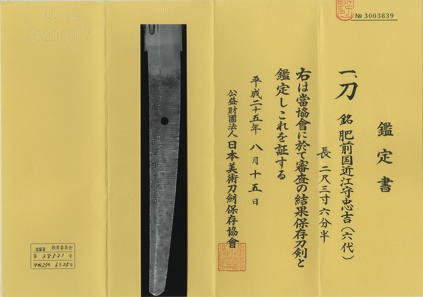Signature :(Tachi Mei) Hizen koku Omi kami Tadayoshi (6th generation)