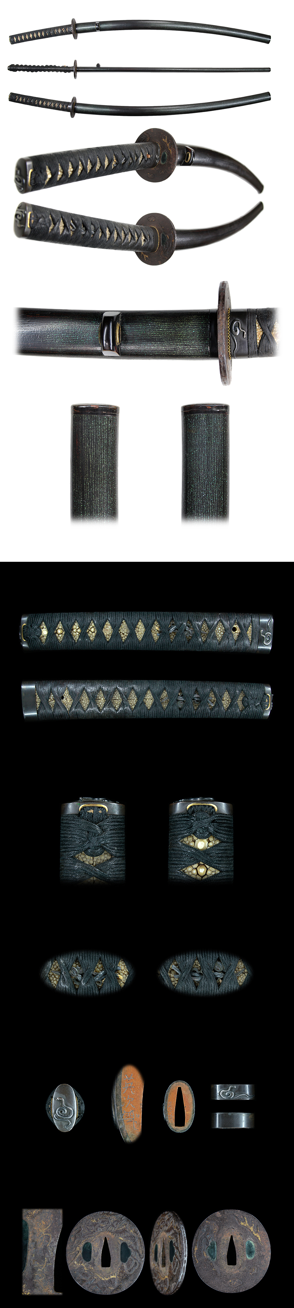 Tsuba :On the round shaped iron Tsuba, a dragon is engraved with gold nunome zogan. Jyakushi school.