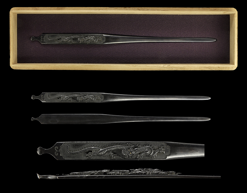 Ordering number:F05100 Kogai Mei (signature): Mumei (Unsigned) In a box made of paulownia wood. Sigature: Unsigned. Length: 22.5cm or 8.86inches. Width: 1.32cm or 0.52inch. Made of yamagane, plant design. Price : JPY 50,000-.