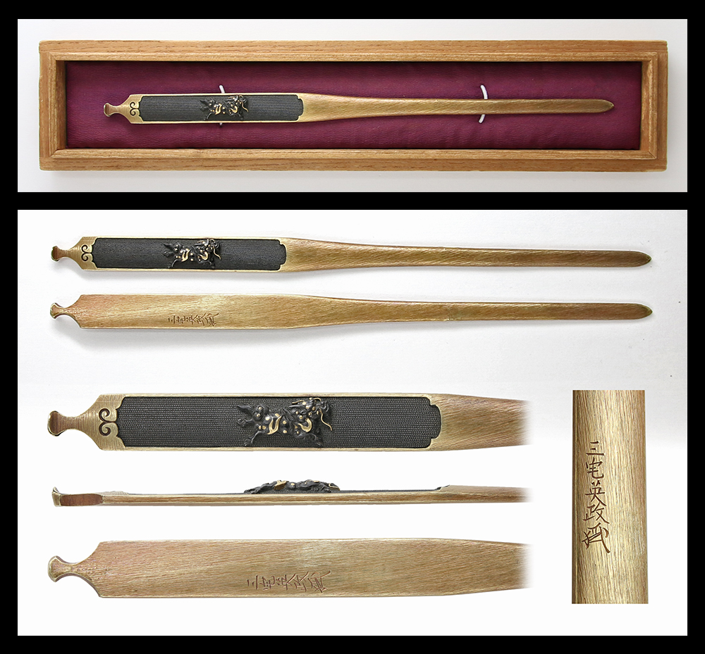 Special feature:Hidemasa has been a successful metal worker during middle Edo period. He was especially good at the Takabori engraving in Yokoya school. On shakudo plate, Kirin design is engraved and inlayed with gold. it is nice kozuka without kizu or flaw.