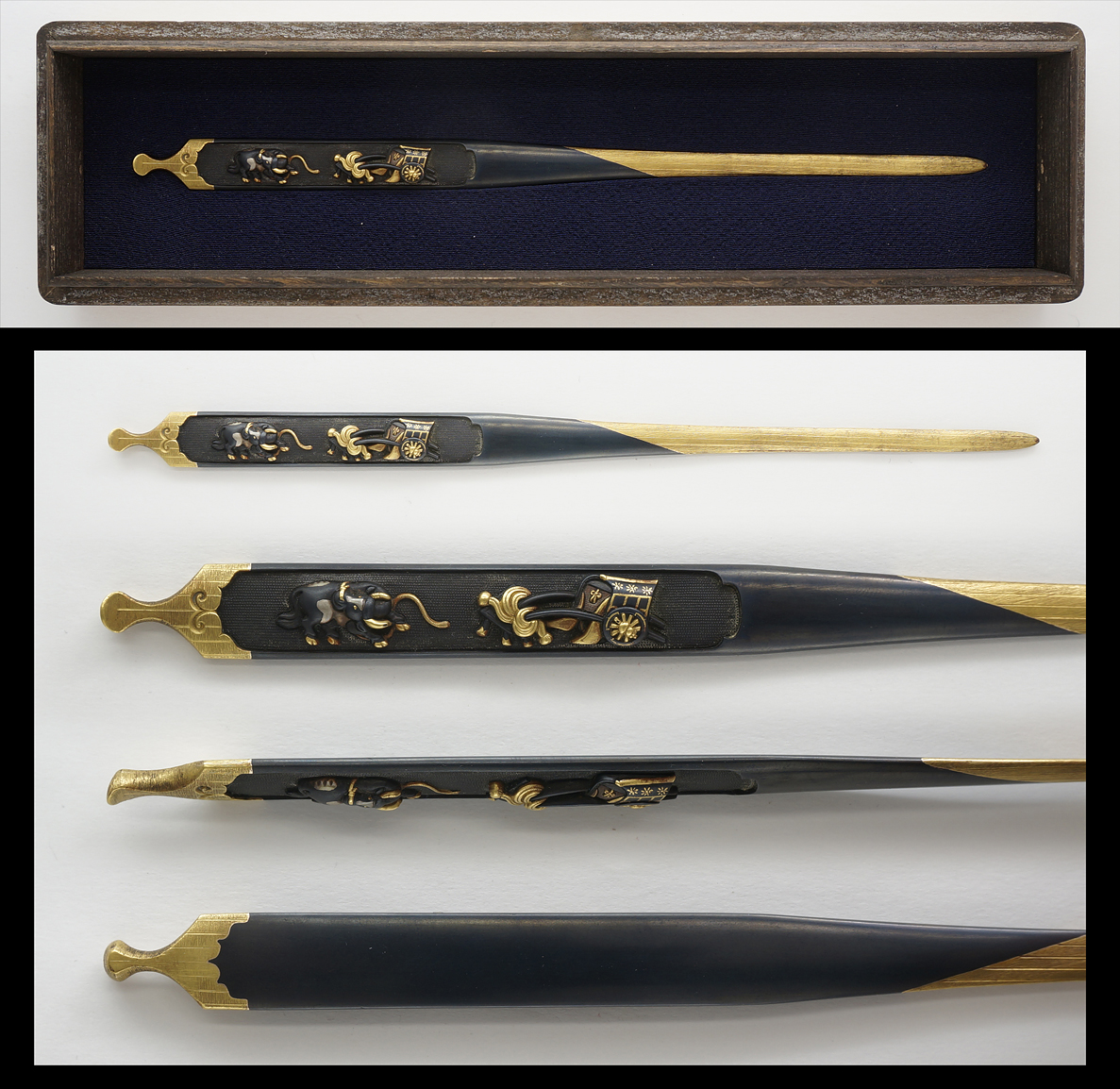 Special feature:Shakudo plate with hackery design engraved and inlayed with gold and silver.