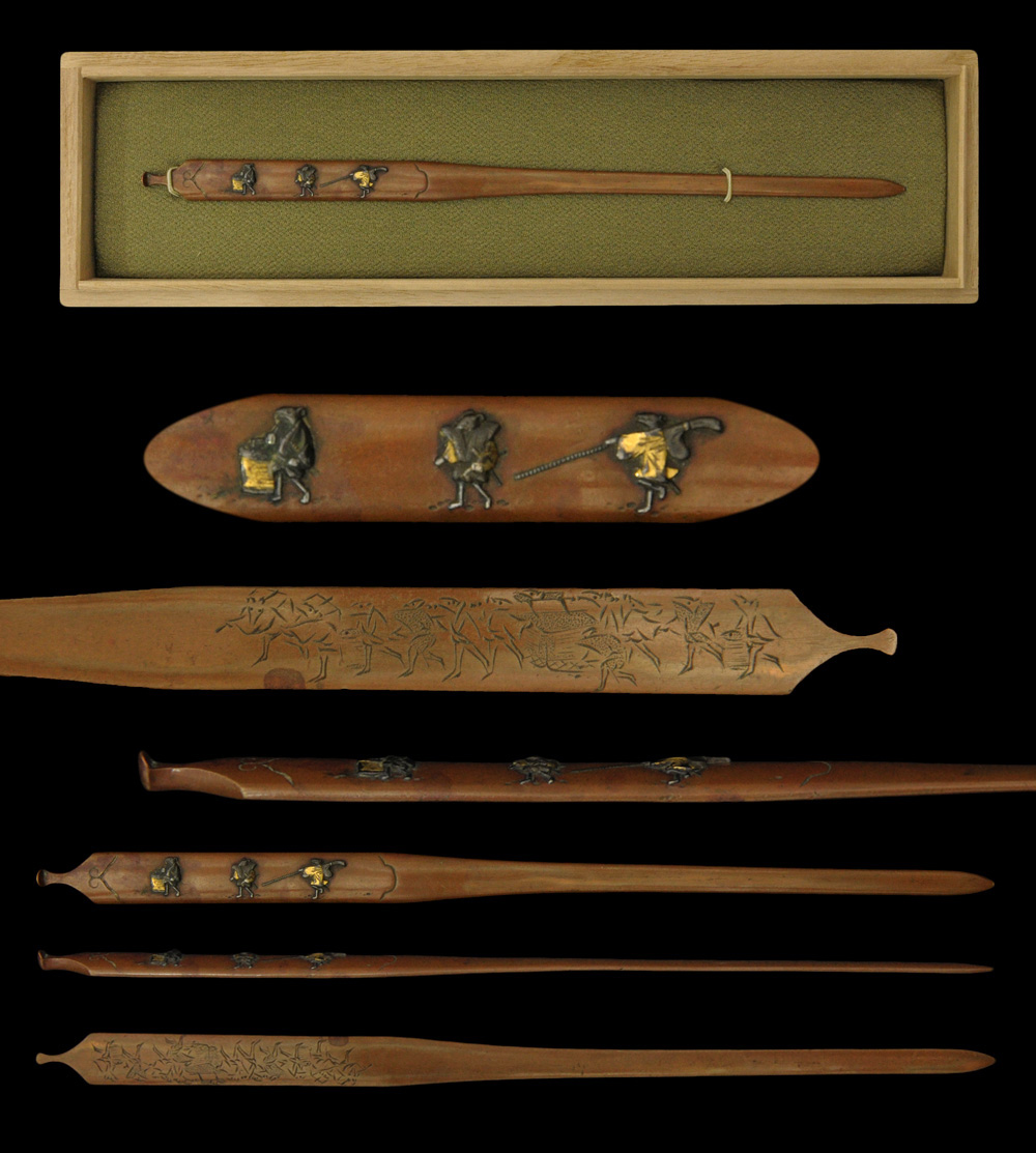 Ordering number : F12577 Kogai: Iron plate. Mei (signature) : Mumei(Unsigned) Length : 21.25 cm x 1.45 cm ( 8.36 inches x 0.57 inches) Jidai(era) : Middle Edo period. Special feature : On the iron nanako plate, cook and female ...