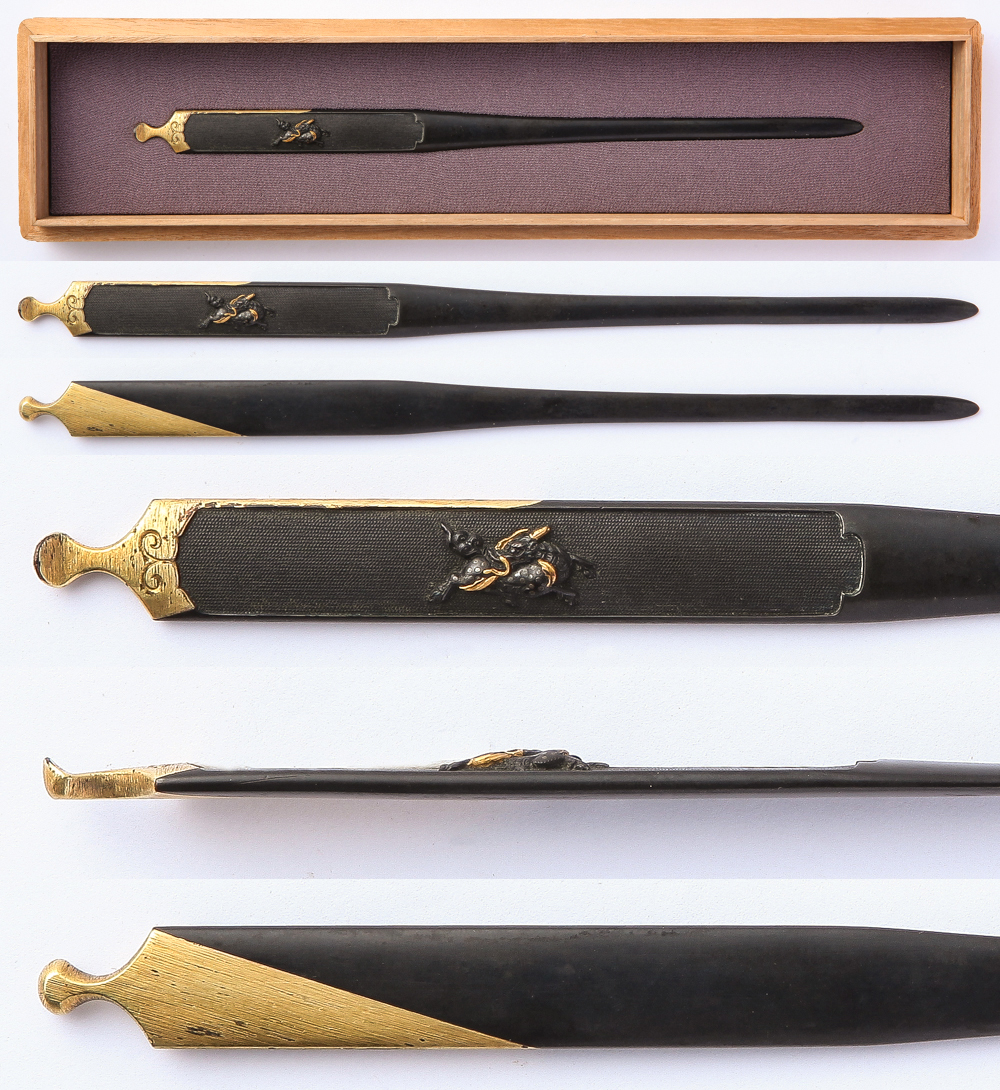 Kogai: Mei (signature) : Mumei(Unsigned) Length : 21.2 cm x 1.12 cm ( 8.34 inches x 0.44 inches) Jidai(era) : Edo period. Special feature: Shakudo Nanako, horsetail and bracken are engraved with gold color. AOI estimation paper In Kiri box. ...