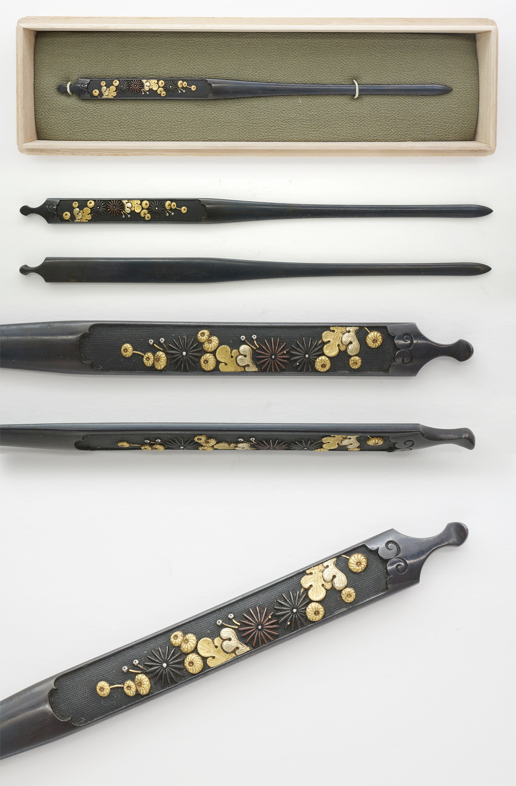Ordering number : F15277 Kogai: (NBTHK Tokubetsu Hozon Paper) Mei (signature) : Nomura Masamitsu (Kao) With Hakogaki(Box Sign): Kogai Nomura Masamitsu Length : 21.2cm x 1.22cm (8.35inch x 0.48inch) Jidai(era) : Middle Edo Period Special feature: Shakudo Nanakoji plate with ...
