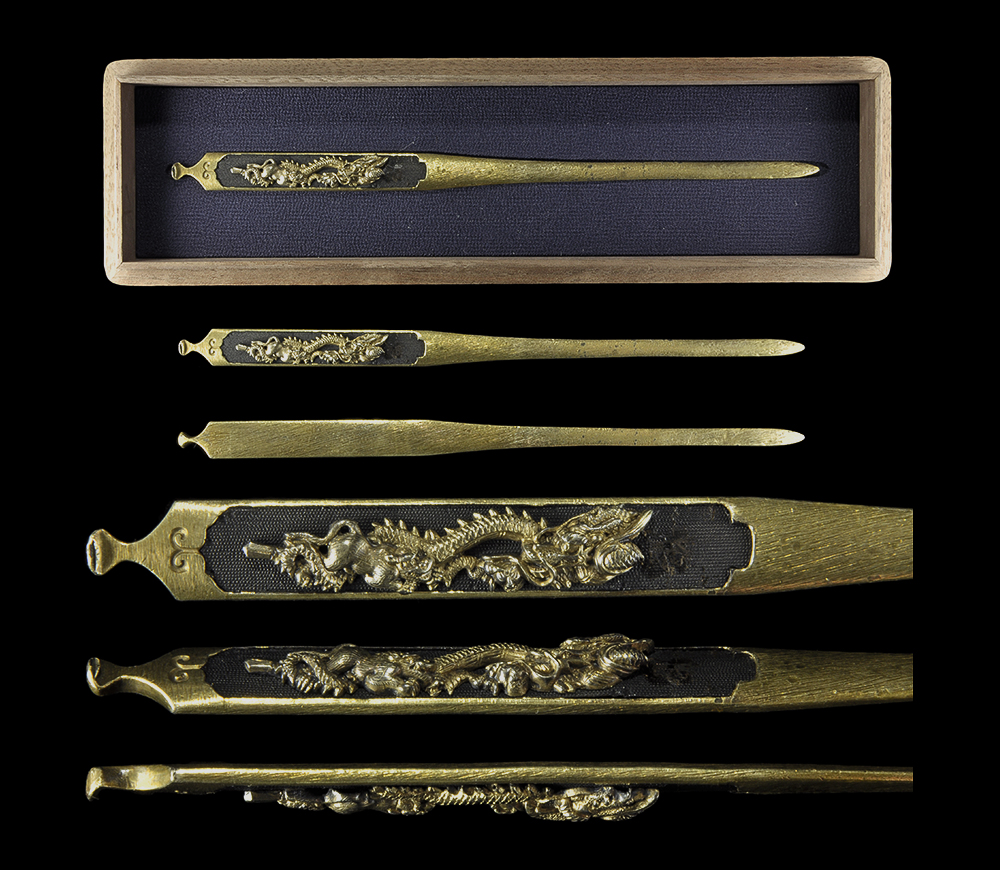 Ordering number : F15277 Kogai: (NBTHK Tokubetsu Hozon Paper) Mei (signature) : Nomura Masamitsu (Kao) With Hakogaki(Box Sign): Kogai Nomura Masamitsu Length : 21.2cm x 1.22cm (8.35inch x 0.48inch) Jidai(era) : Middle Edo Period Special feature: Shakudo Nanakoji plate with ...
