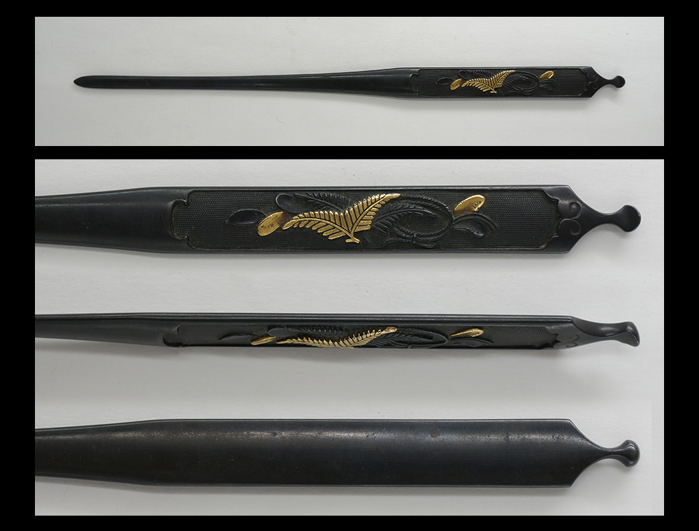 Ordering number : F15730 Kogai : (NBTHK Hozon Paper) Mei (signature) : Mumei (Unsigned)(Yoshioka) Length : 21.2 cm x 1.23 cm ( 8.34 inches x 0.48 inches) Jidai(era) : Edo period. Special feature : Shakudo Nanako, Aoi-mon with gold color. ...