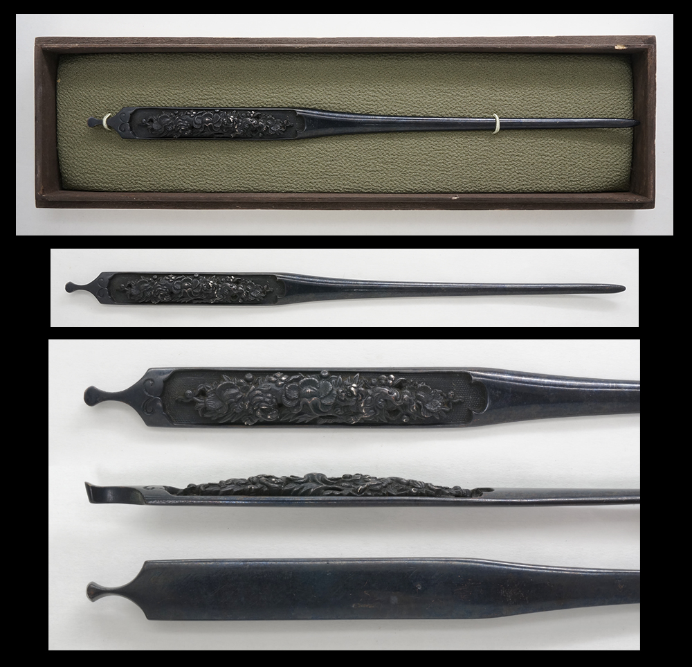 Ordering number : F12331 Wari-Kogai: Mei (signature) : Mumei(Unsigned) Length : 20.5 cm x 1 cm (8.07 inches x 0.39 inches) Jidai(era) : Edo Period Special feature : On shakudo plate wari kogai, karakusa(arabesque) pattern and phoenix design is engraved ...