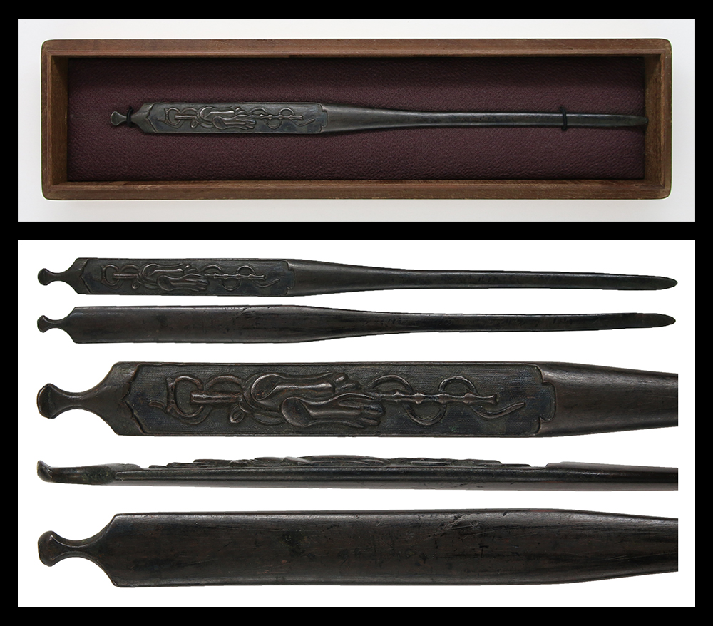 Kogai Ordering number:F05099 In a box made of paulownia wood. Sigature: Unsigned. Length: 22.0cm or 8.66inches. Width: 1.36cm or 0.54inch. Made of yamagane, plant design. Price : JPY 50,000-.