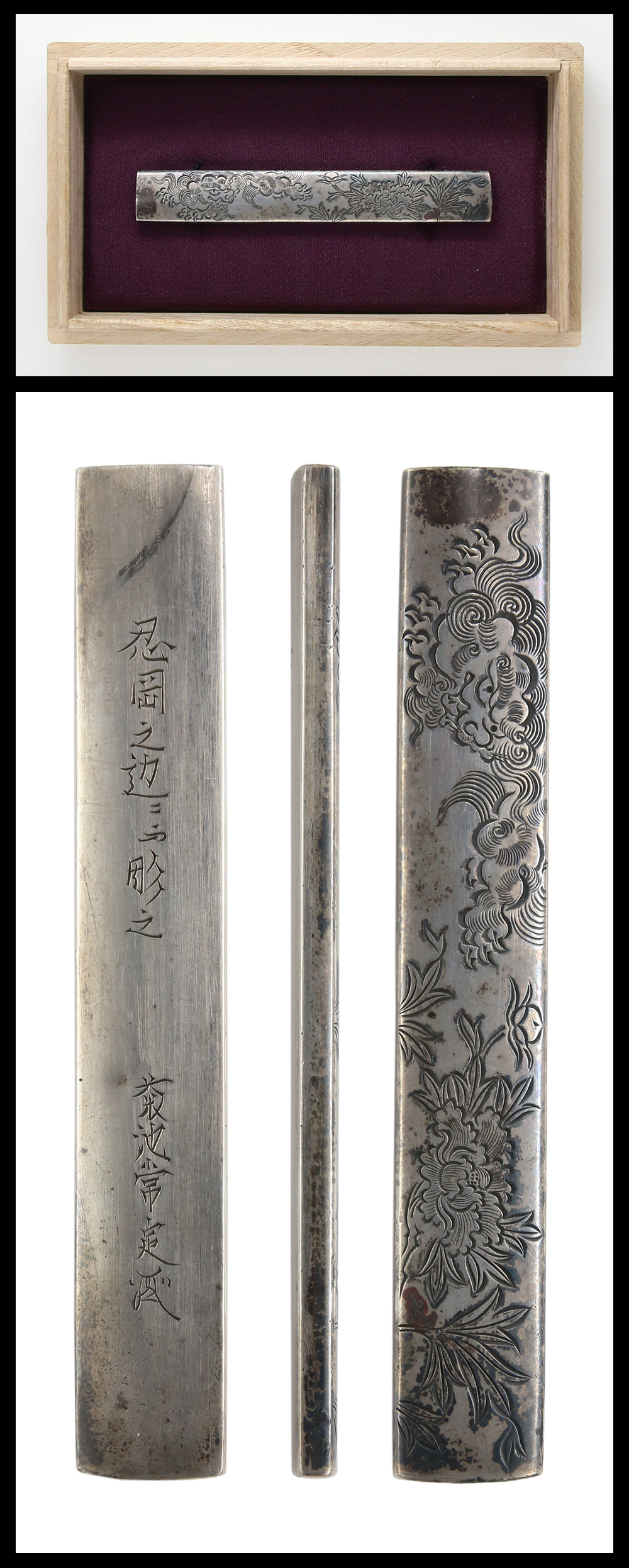 Special feature: On silver migaki-ji, shi-shi dog and peony design is engraved in Katakiri-bori style. The curved fine lines shows the kozuka lively and dynamic.