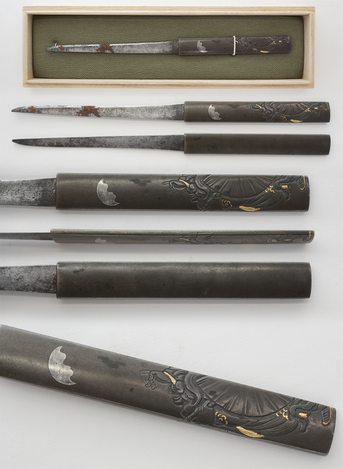 Special feature: On the Shibuichi plate, moon and a person who put up an umbrella are engraved with gold and silver color. This Kozuka is well composed. Unfortunately the tip of Kogatana is lacked.