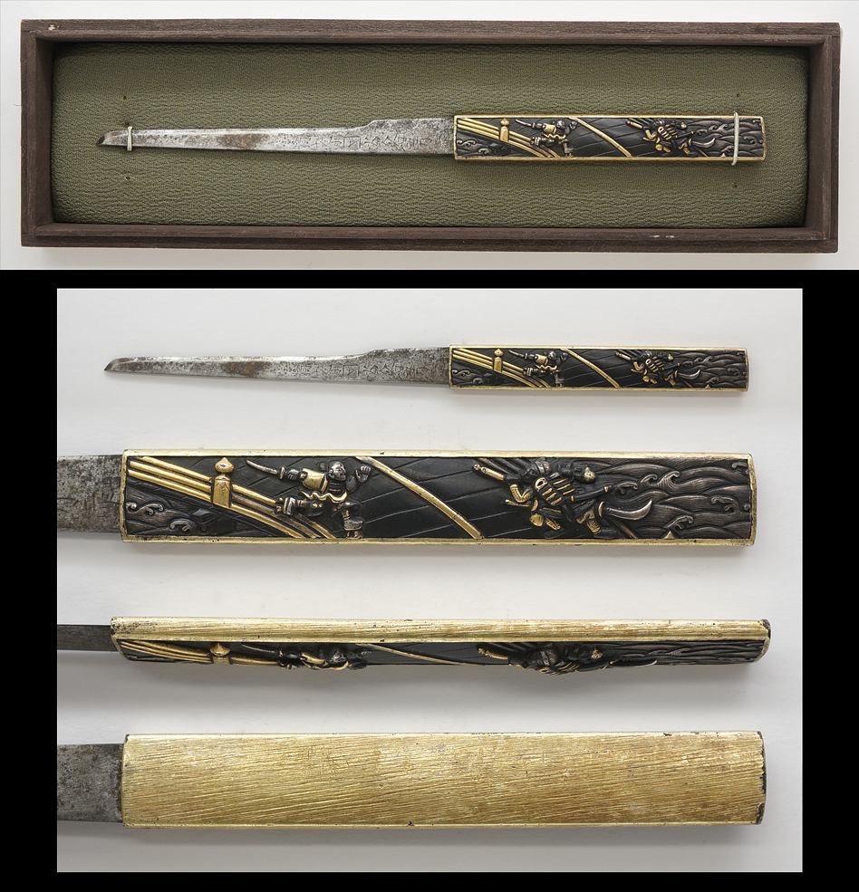 There is some rusts on the kogatana so some of the letters on the blade is hard to identify. However, the kozuka has nice Battle scene engraved with much liveliness.,