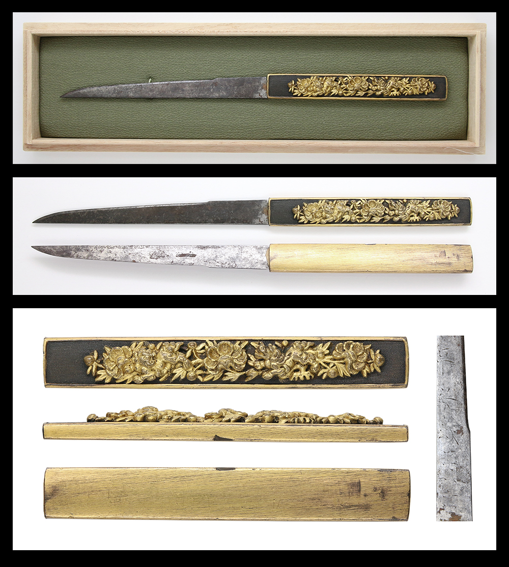 Special feature:On shakudo nanakoji plate, peony and Shi-Shi dog design is engraved and inlayed with gold. It is gorgeous design with wonderful design. On the blade it is engraved Heianjyo Nagayoshi.