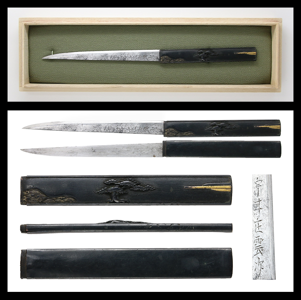 Special feature: Kozuka: On shakudo nanakoji plate, pine design is engraved and inlayed with gold.