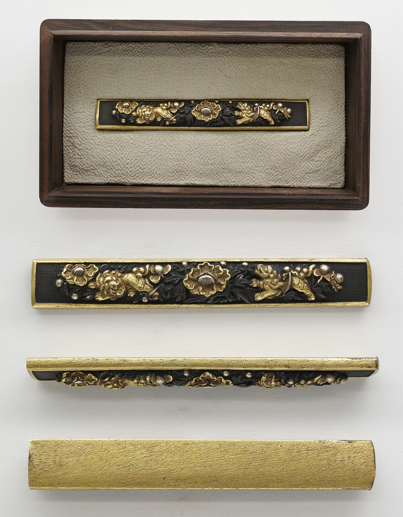 Special feature: Shakudo nanakoji plate with Shishi dog and peony design engraved and inlaid with gold. It is gorgeous style kozuka.