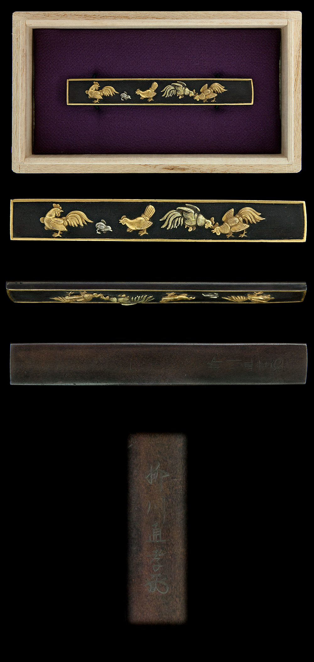 Kozuka: (NBTHK Tokubetsu Kicho Paper) Mei (signature) : Shigemitsu (Nara) Length : 9.65cm x 1.43cm ( 3.8inches x 0.56inches) Jidai(era) : Late Edo period. Special feature: Shigemitsu is Nara Shigeharu’s student. He has engraved mountain, flower and bird design. This ...