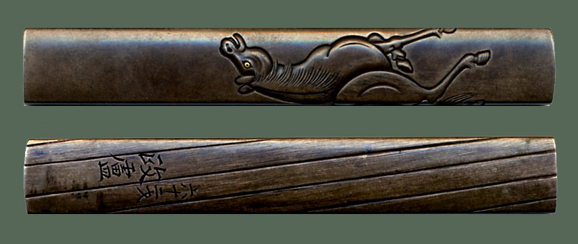 Masayoshi was born in 1764 at Shitaya in Edo. He learned under Toyama Naoyoshi and the Hamano family. According to the inscription on the reverse side, Masayoshi made thsi tsuba at the age of 62. He passed away in 1837, aged 74.