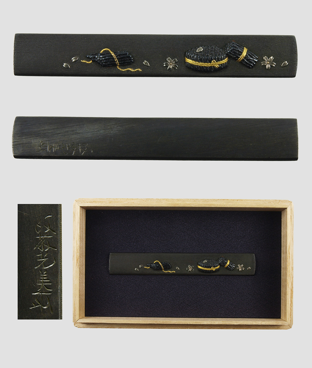 Special feature: On the Shakudo nanako plate, fagot are engraved.