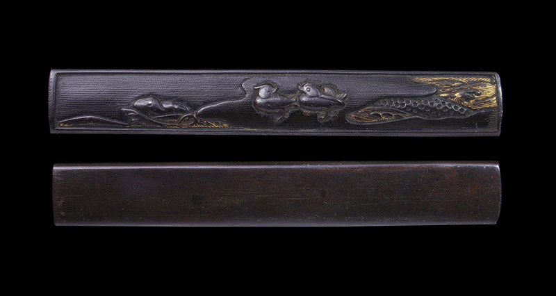 Ordering number : F13448 Kozuka: Mei (signature) : Sadatada saku(Made by Sadatada) Length : 9.8cm x 1.4cm ( 3.86inches x 0.55inches) Jidai(era) : Late Edo period. Special feature: On shakudou nanakoji plate,rats are engraved and inlayed with gold. The rats ...