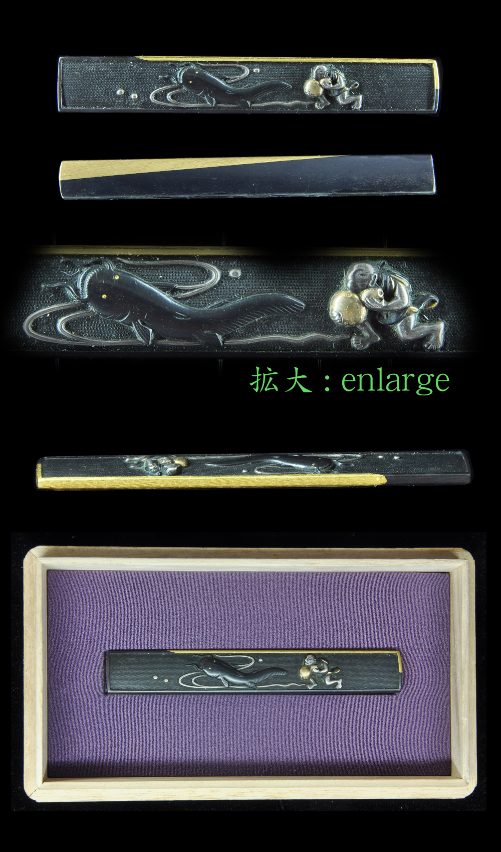 Kozuka: (NBTHK Hozon Paper) Mei (signature) : Mumei(Kojyo) Length : 9.66cm x 1.38cm ( 3.8inches x 0.54inches) Jidai(era) : Late Muromachi Period to early Edo Period Special feature: Shakudo nanakoji plate with horse and child design engraved and inlaid with ...