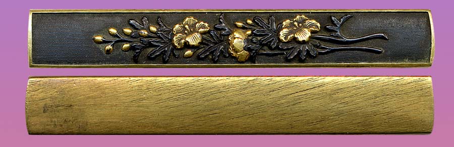 Confederate rose design shakudo kozuka. Carved with taka-bori and colored with gold iroe.