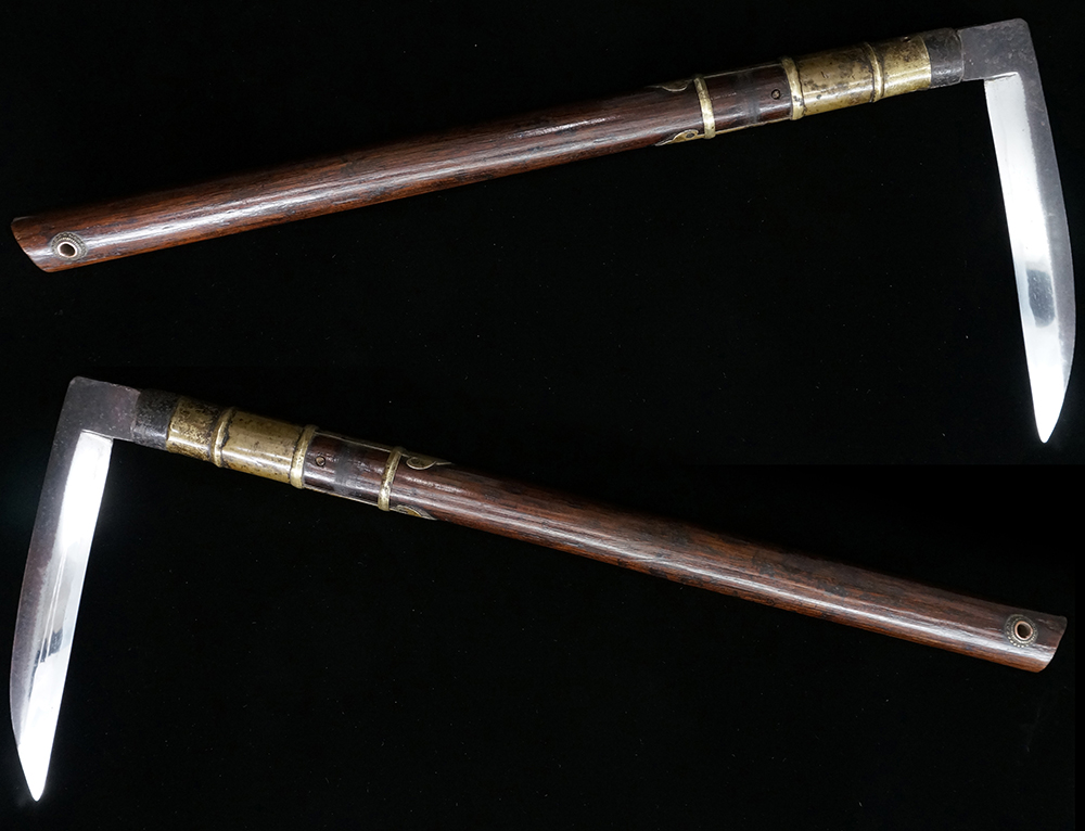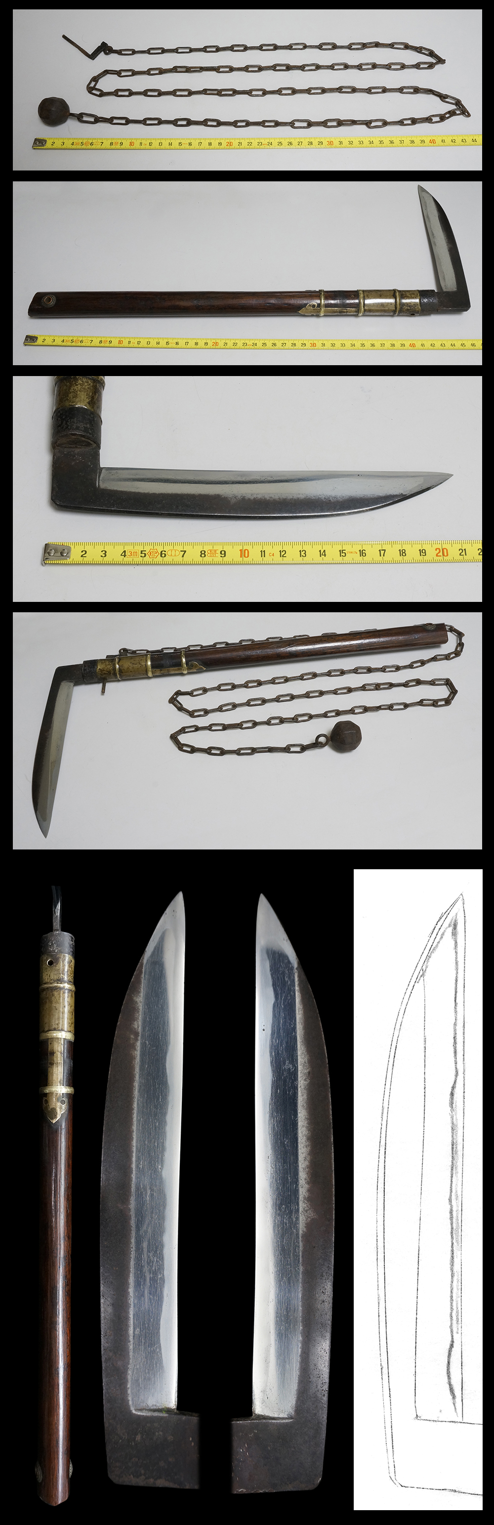 The kusarigama (chain-sickle) is a traditional Japanese weapon that consists of a kama (the Japanese equivalent of a sickle) on a metal chain (kusari) with a heavy iron weight (fundo) at the end. The kusarigama is said to have developed during the Muromachi period.The art of handling the kusarigama is called kusarigamajutsu.