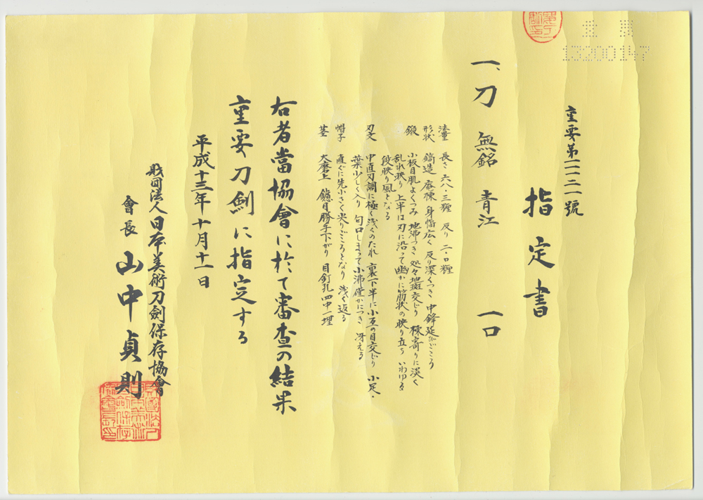 Signature: Mumei (unsigned) attributed as Aoe school.