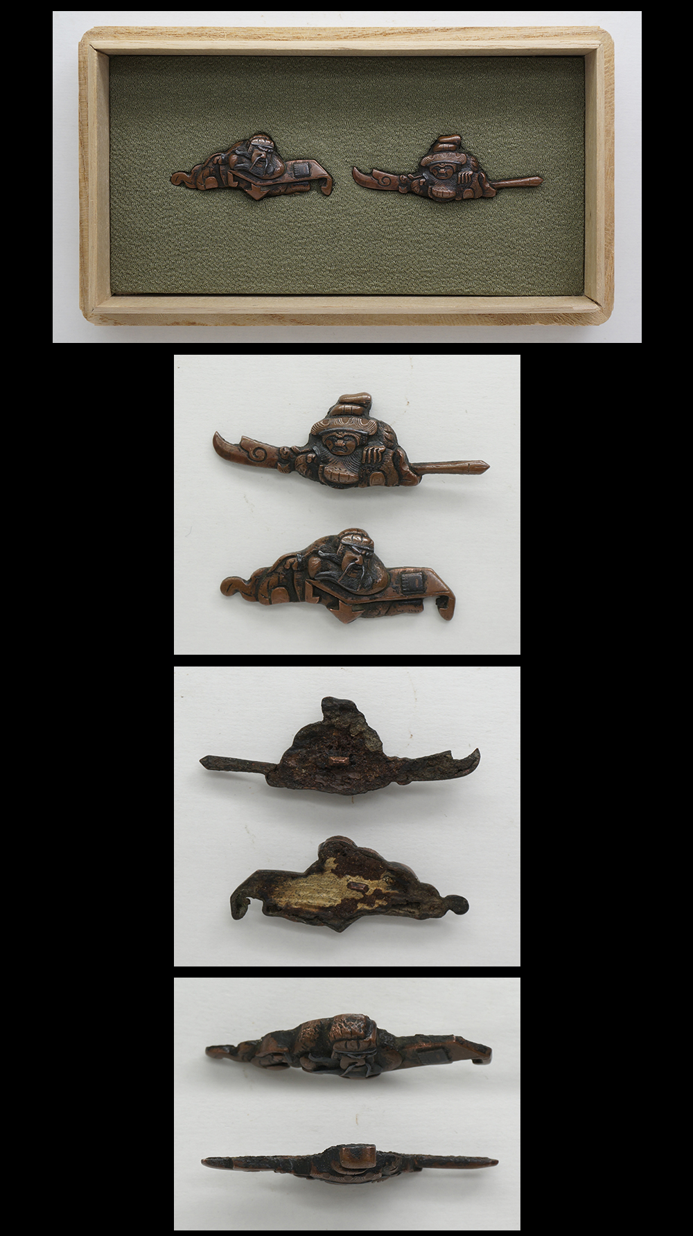 Ordering number : F13358 Menuki : Mei (signature) : mumei(Unsigned) Length 1 : 5.12cm x 1.36cm ( 2.01inches x 0.54inches) Length 2 : 2.16cm x 1.32cm ( 0.85inches x 0.52 inches) Jidai(era) :Edo period Special feature:On shakudou plate, stirrup and ...