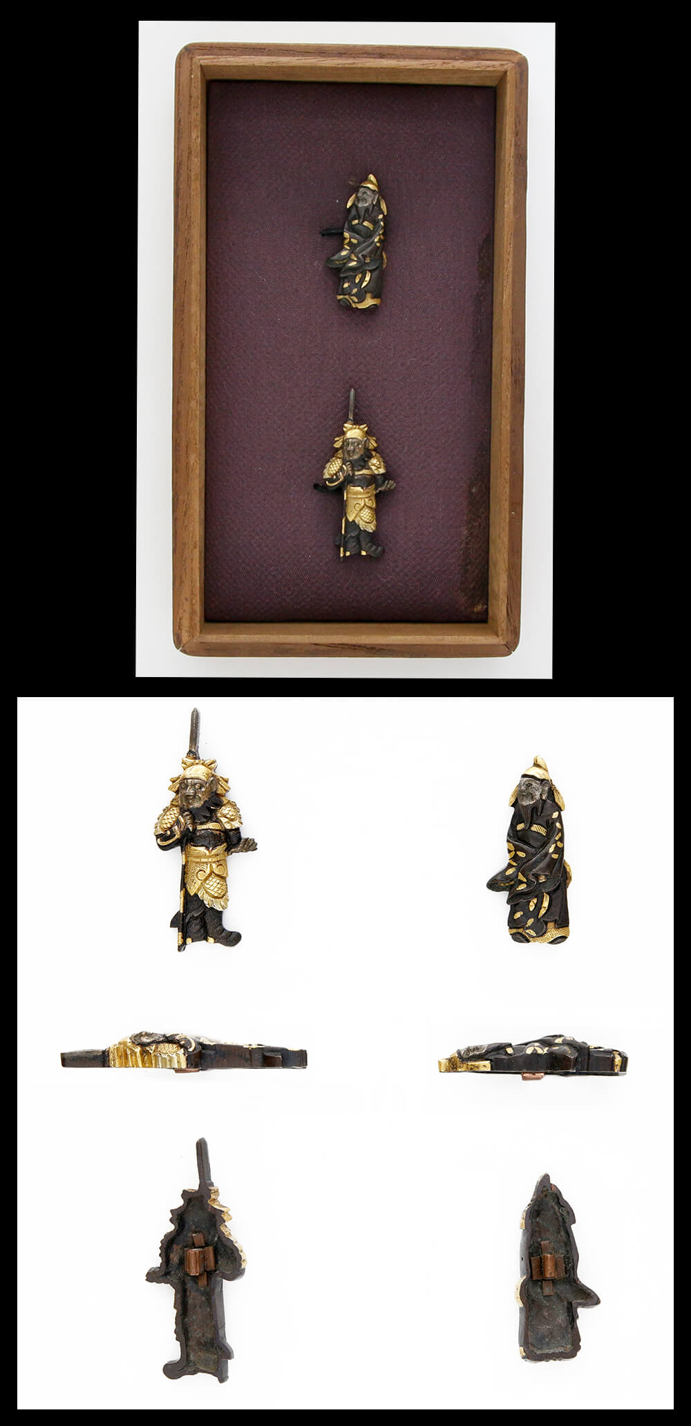 Ordering number : F13803 Menuki : Mei (signature) : mumei(Unsigned) Length 1 : 4.84cm x 2.11cm ( 1.9inches x 0.83inches) Length 2 : 4.86cm x 2.22cm ( 1.91inches x 0.87inches) Jidai(era) :Edo Period Special feature: On shibuichi plate, men playing ...