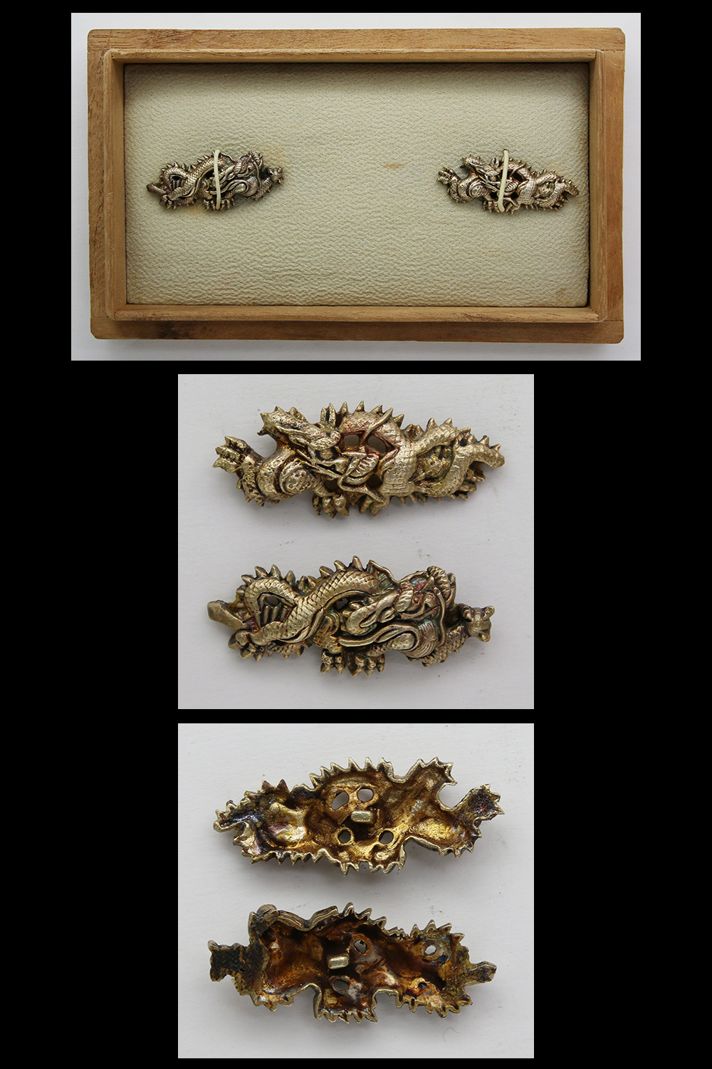 Menuki : Signature : Mumei (unsigned) 1 Length : 4.80 x 1.85 cm ( 1.90 x 0.73 inches.) 2 Length : 4.70 x 1.75 cm ( 1.85 x 0.69 inches.) Era : Later Edo to Meiji Period Special feature : Dragon ...