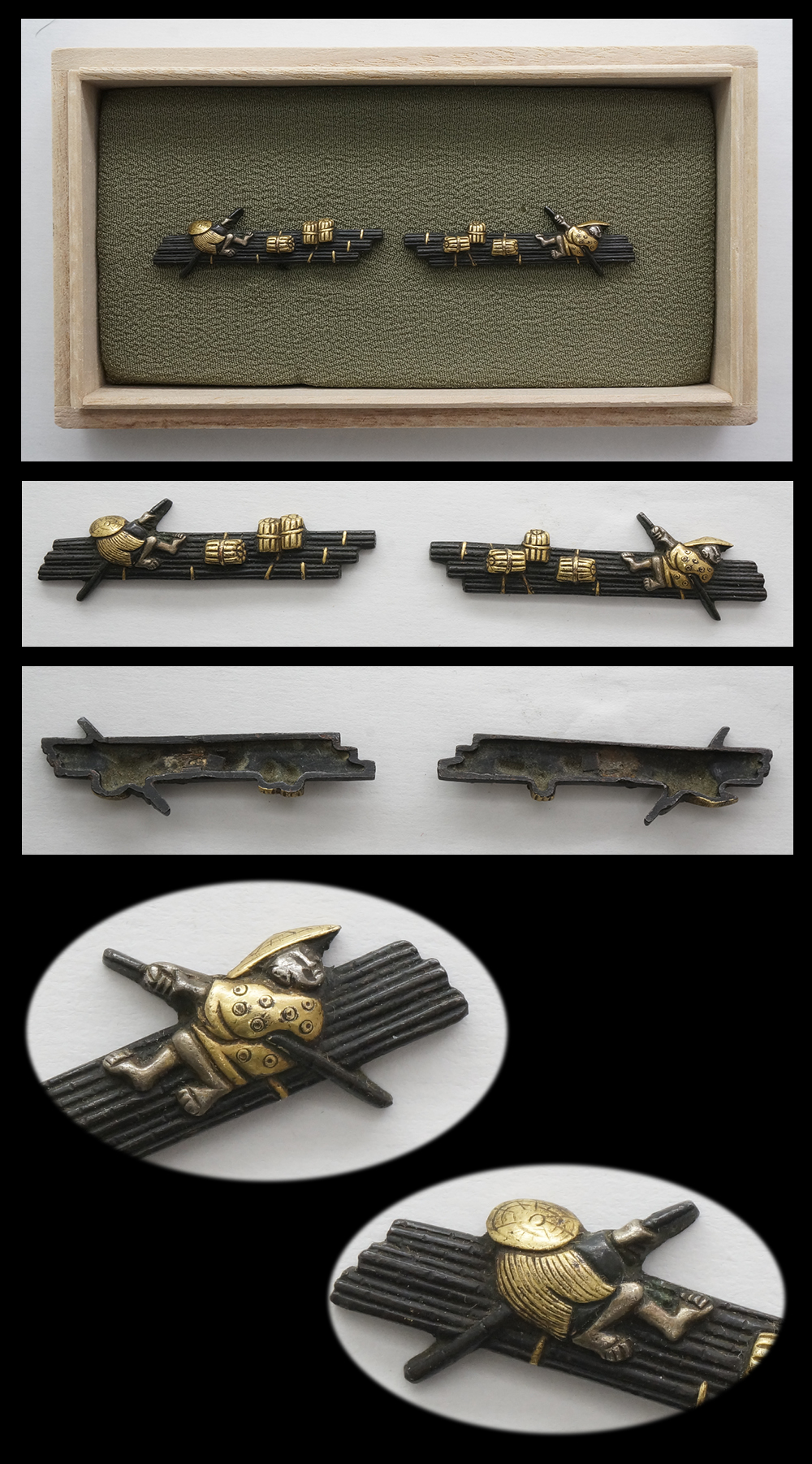 Special feature:On shakudou nanakoji plate, Ikada nagashi(floating timber downstream) design is engraved and inlayed with gold. Ikada-nagashi was used to bring the woods during the great fire of Edo. It is interesting design.