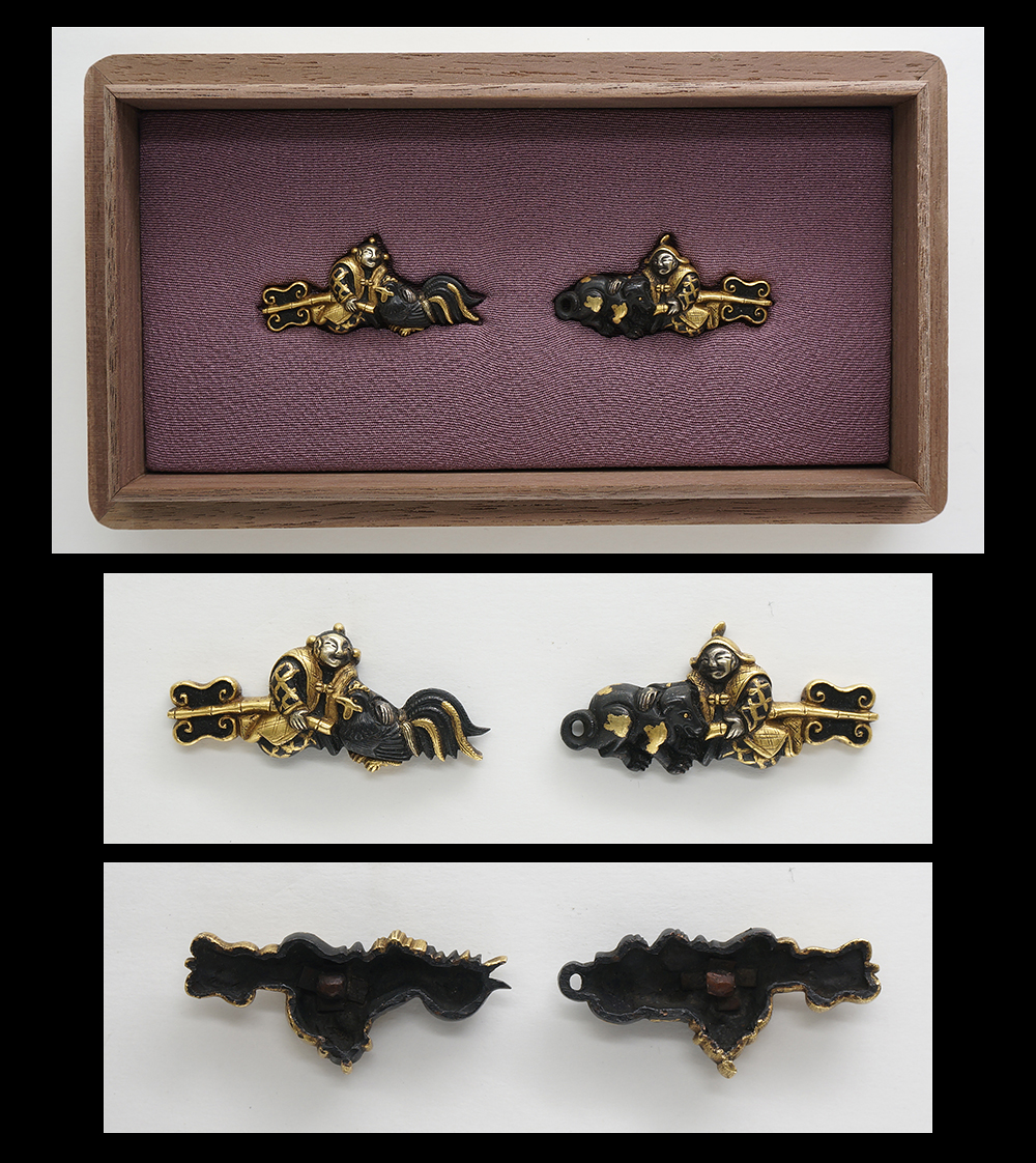 Special feature: On shakudo plate, a boy dressed in ancient Chinese cloth is engraved with gold. This item is very good condition and also fantastic gorgeous work.