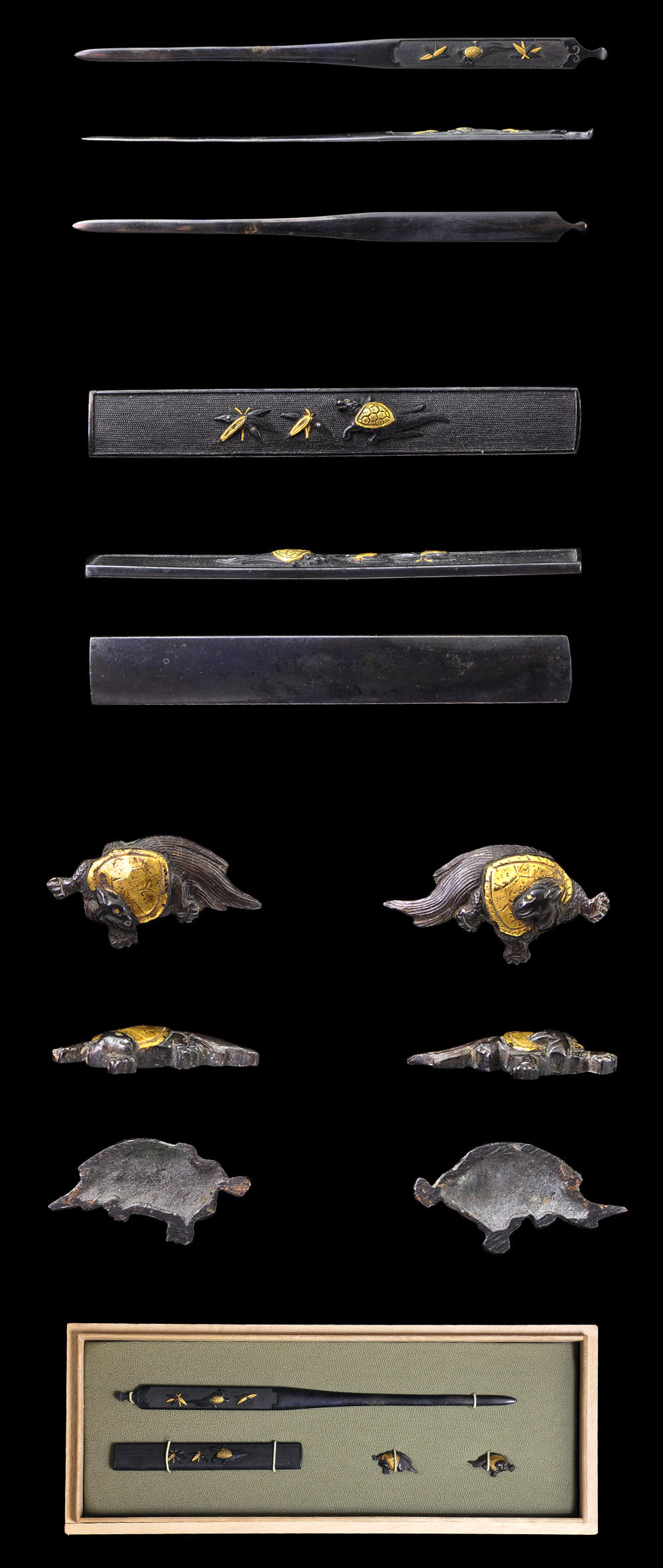 Special feature: On the syakudo nanako plate, turtles and grasses are engraved with gold color iroe.