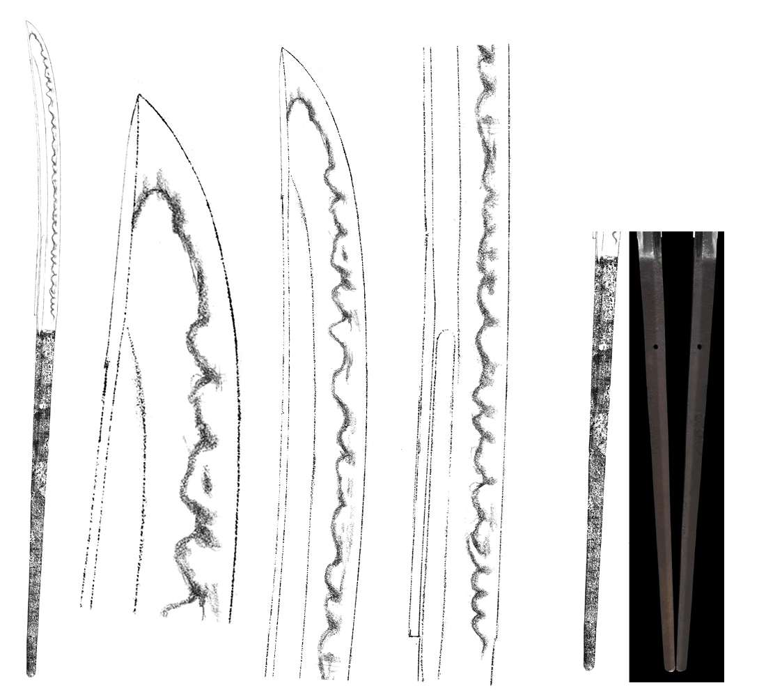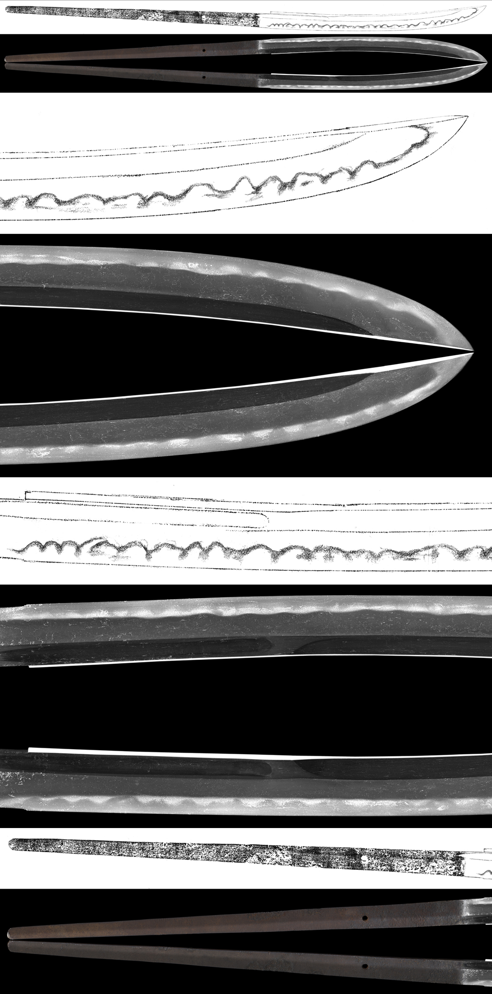 Hamon : Niedeki gunome midair with rather thick nioikuchi with ash, sunagashi and kinsuji work.