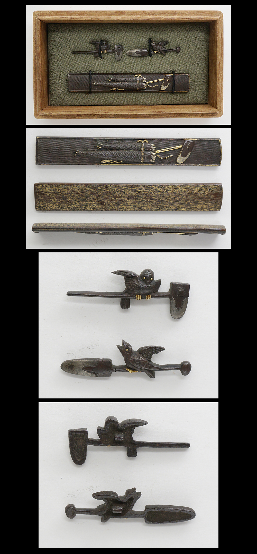 Menuki: On shakudo plate a design of sparrow like bird staying on hoe is engraved and inlayed with gold and silver.