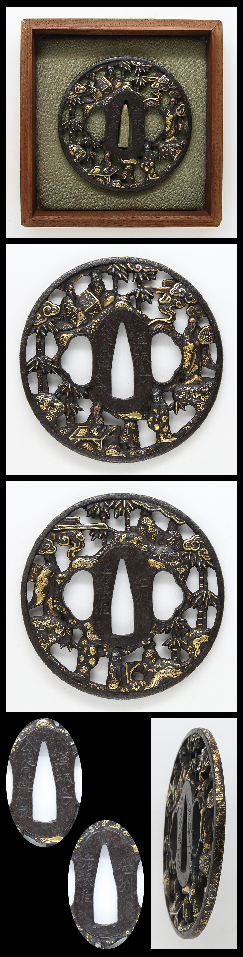Special Feature: On shakudo nanakoji plate, man and chrysanthemum are engraved and inlayed with gold.