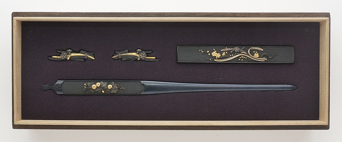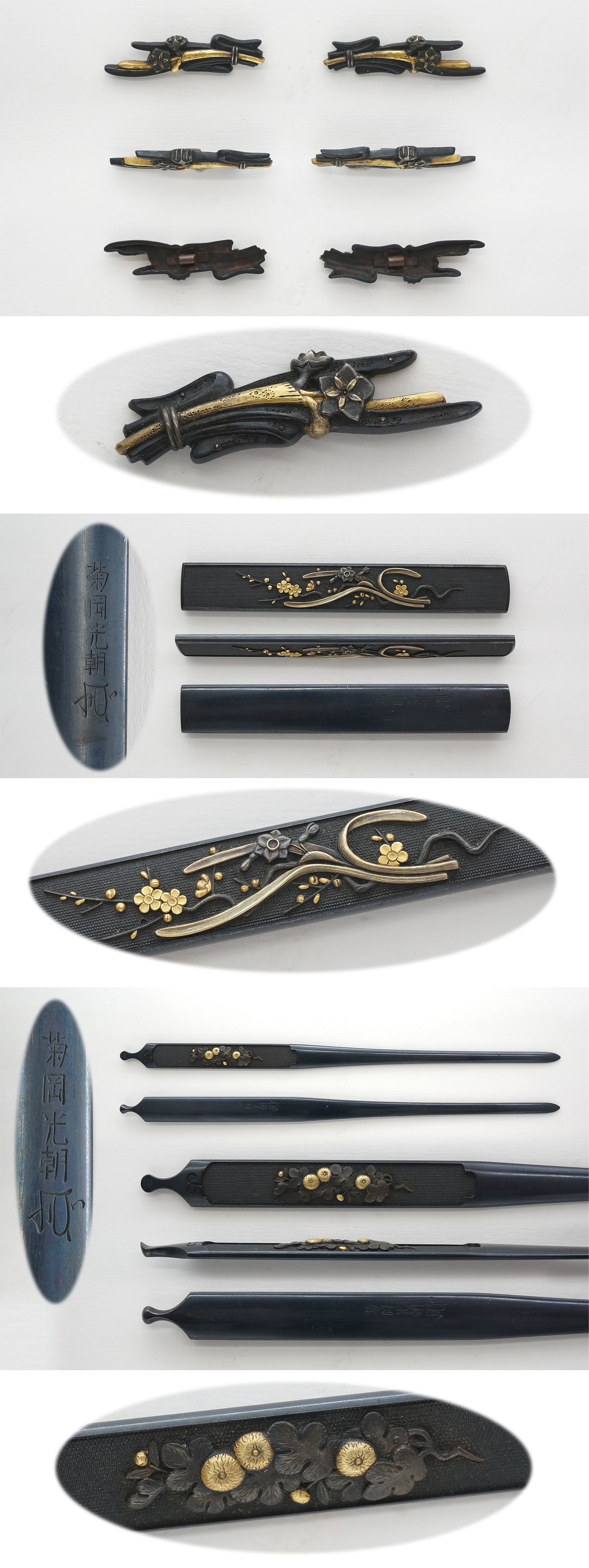 Kozuka and Kogai: Shakudo nanakoji plate with chrysanthemum design egnraved on the Kogai. On the Kozuka plum and narcissus designs are engraved and inlaid with gold.