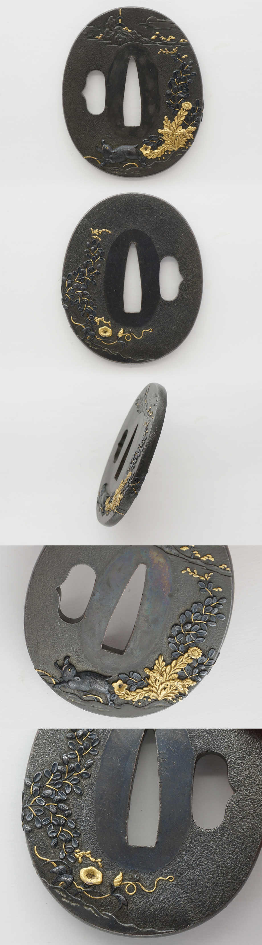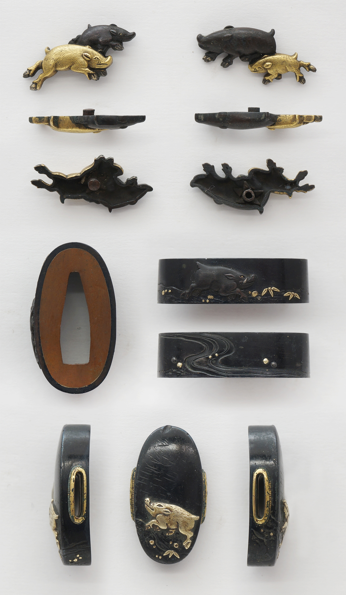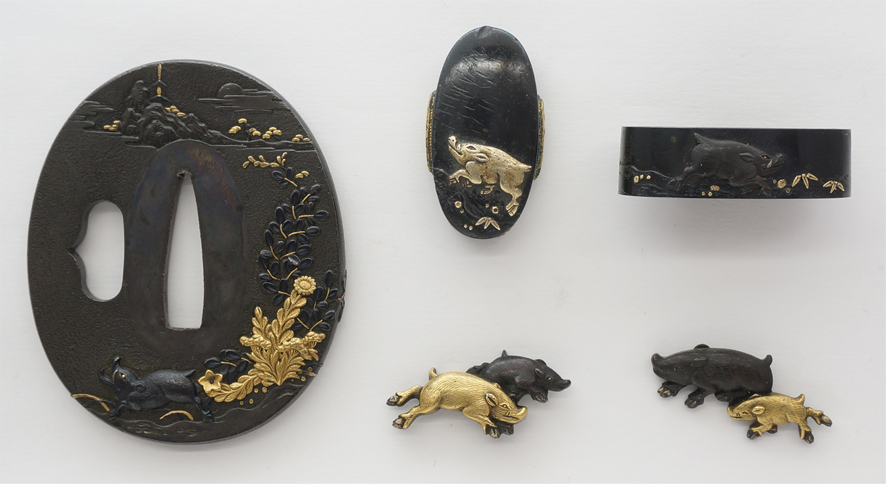 Special feature: On Shakudo, the boar theme are engraved with gold and copper color.