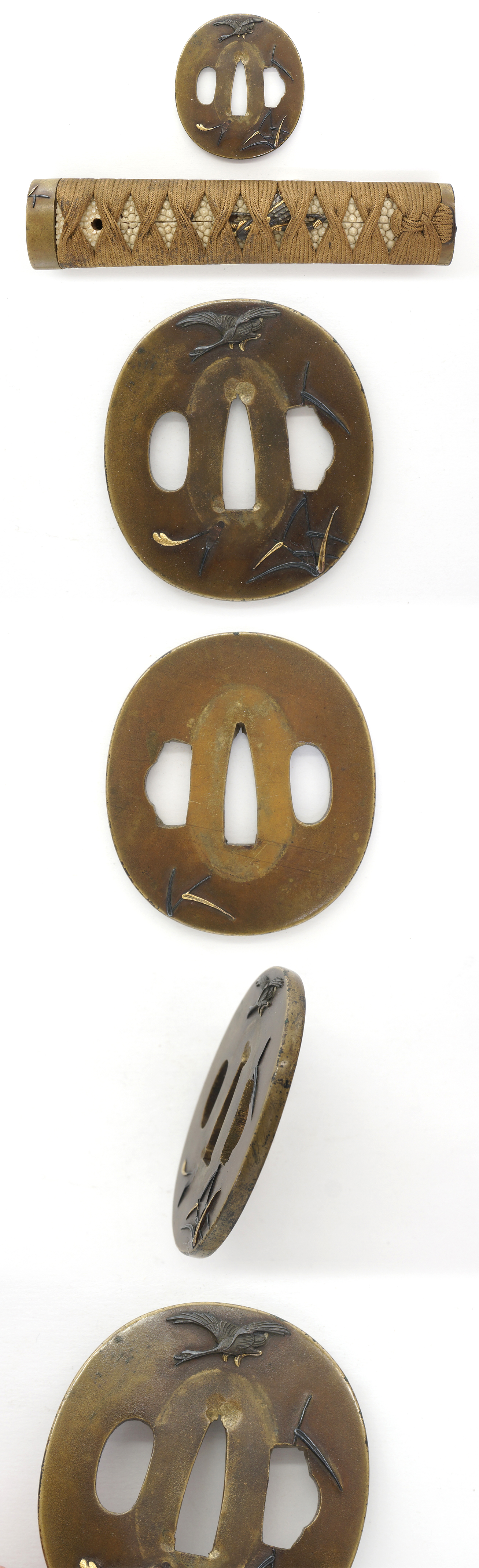 Tsuba : Brass, water bird and water grass are engraved with gold and Shakudo color.