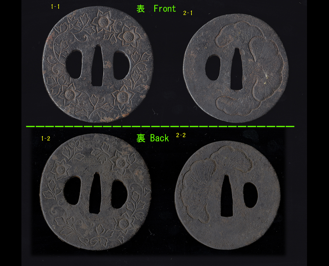 Special feature:On round shape iron tsuba, flower design is engraved.