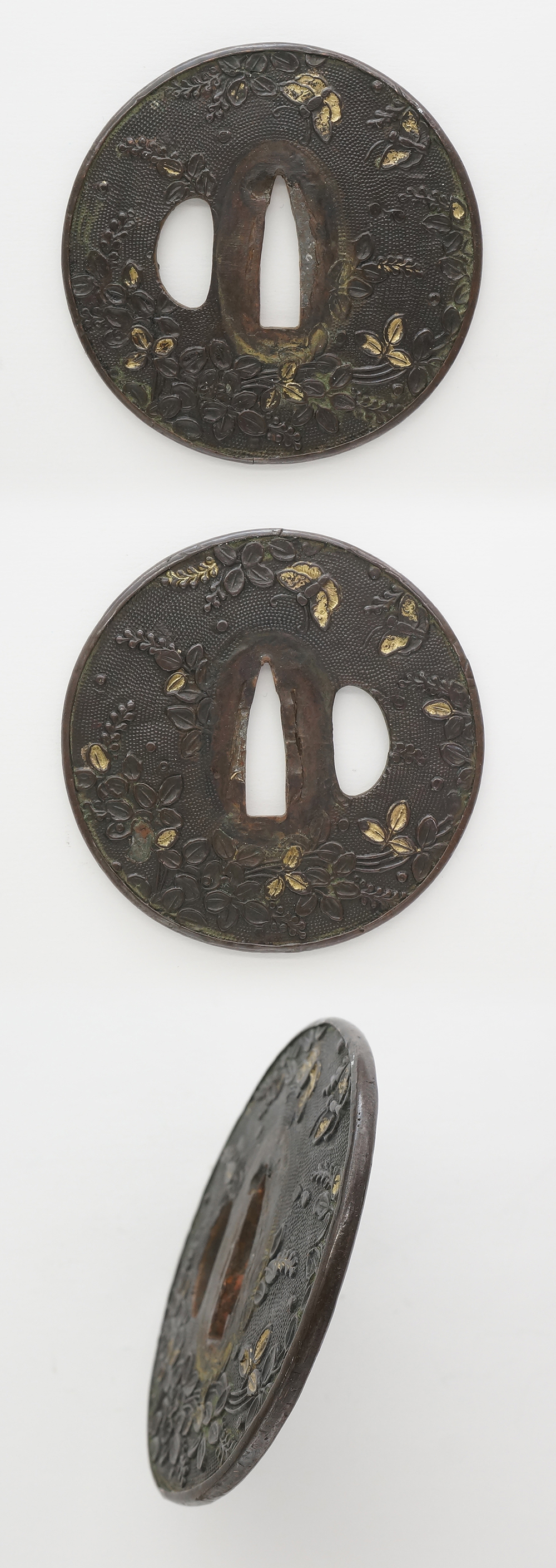 Special feature: Round shape iron tsuba with autumn plants and butterfly engraved and inlaid with gold.
